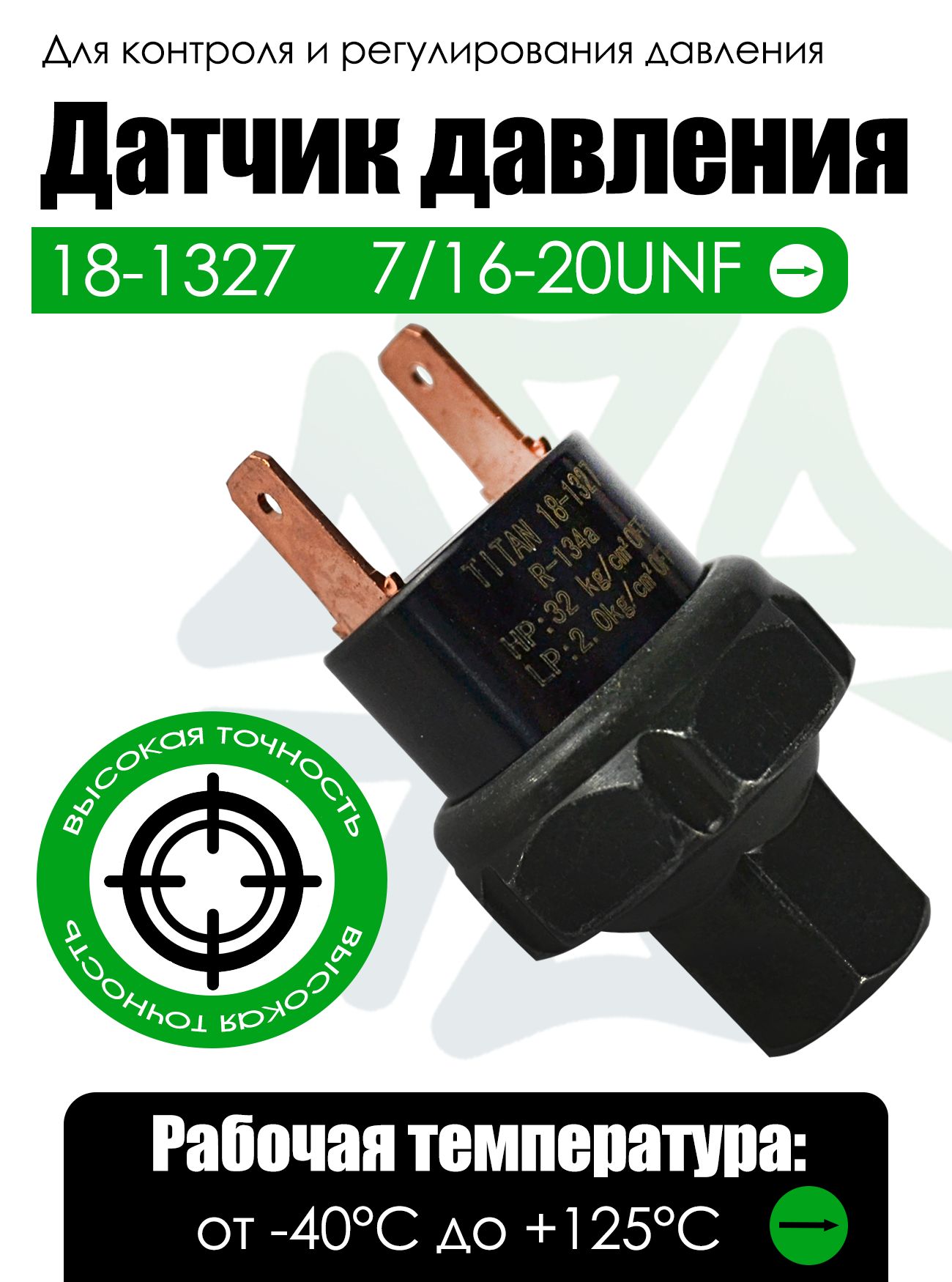 Датчик давления 18-1327 (7/16-20UNF) - применяется для контроля параметров давления в холодильном контуре коммерческого и промышленного холодильного оборудования, системах кондиционирования воздуха и вентиляции. Он оснащен внутренней резьбой 7/16-20UNF, что обеспечивает надежное и герметичное подключение к системам. Области применения датчика весьма широки и включают автомобильные кондиционеры, рефрижераторы, автохолодильники и различные системы климат-контроля. Устройство эффективно защищает компрессор от перегрузок, предотвращает попадание воздуха во фреоновую магистраль при низком давлении и обеспечивает своевременное включение системы охлаждения при повышенных показателях.