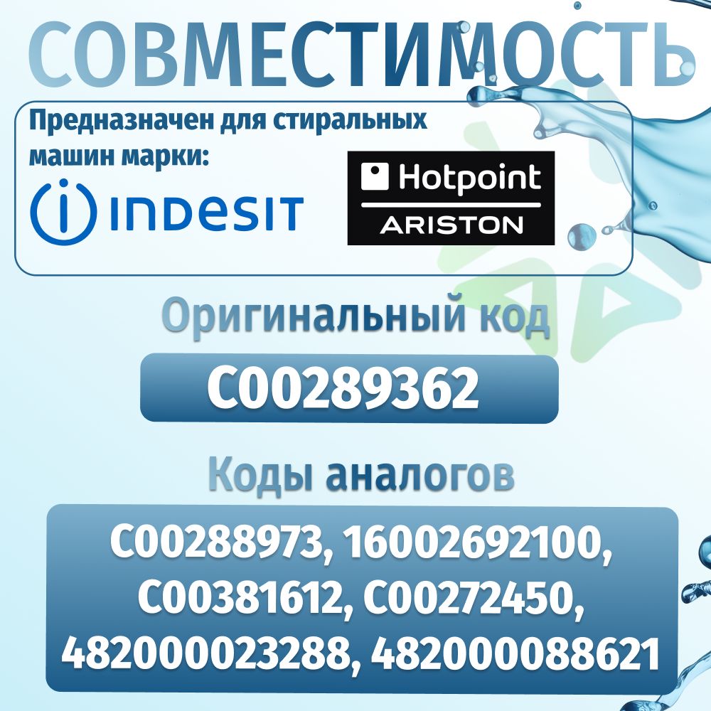 Датчик уровня воды в стиральной машине - запчасть, основная функция которой заключается в определении наличия воды в баке и ее уровня. Данное реле уровня воды C00289362 предназначен для стиральных машин Indesit и Hotpoint-Ariston. Этот прессостат имеет 2 контакта и размеры: 68*55 мм. Размер штока - 13 мм. Коды аналогов: C00288973, 16002692100, C00381612, C00272450, 482000023288, 482000088621.