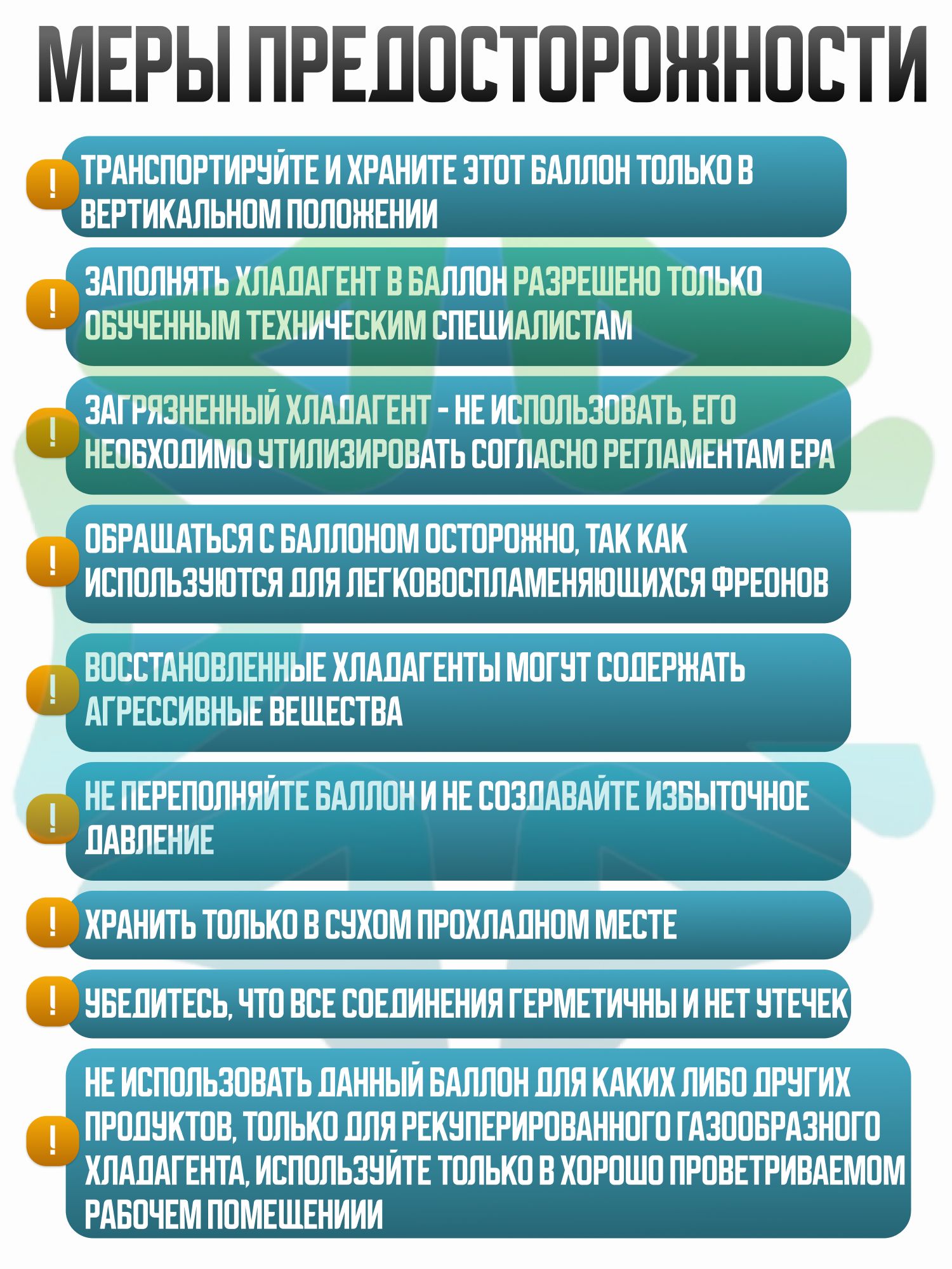 Безопасность является приоритетом при работе с хладагентами. Бак изготовлен с учетом требований к работе с легковоспламеняющимися фреонами, поэтому необходимо соблюдать максимальную осторожность. Запрещается использовать загрязненный хладагент, который подлежит утилизации в соответствии с регламентами EPA. Кроме того, важно избегать переполнения баллона и создания избыточного давления.