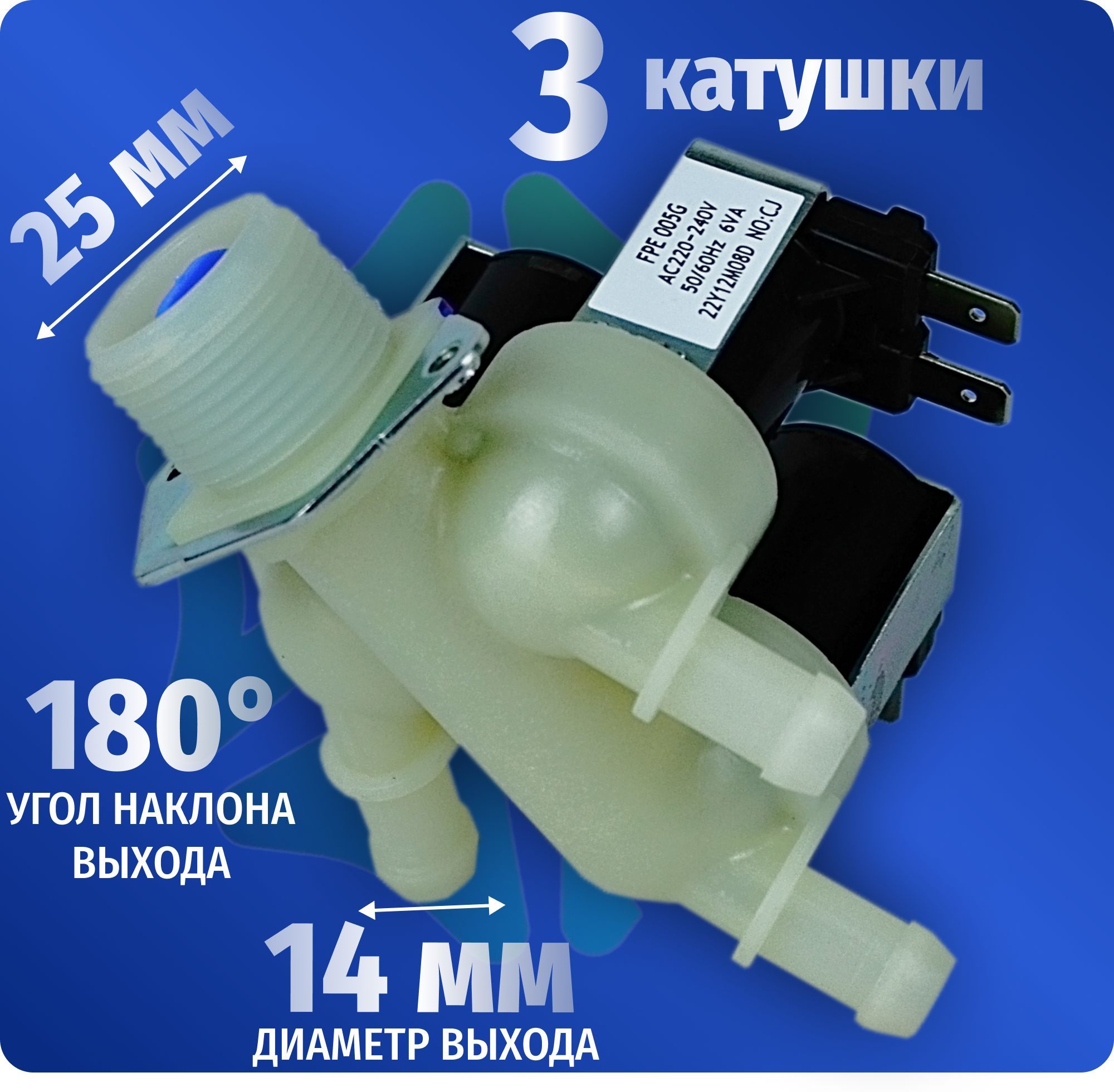 Этот электромагнитный клапан подачи воды имеет 3 катушки, угол наклона выхода 180° и диаметр выхода 14 мм.