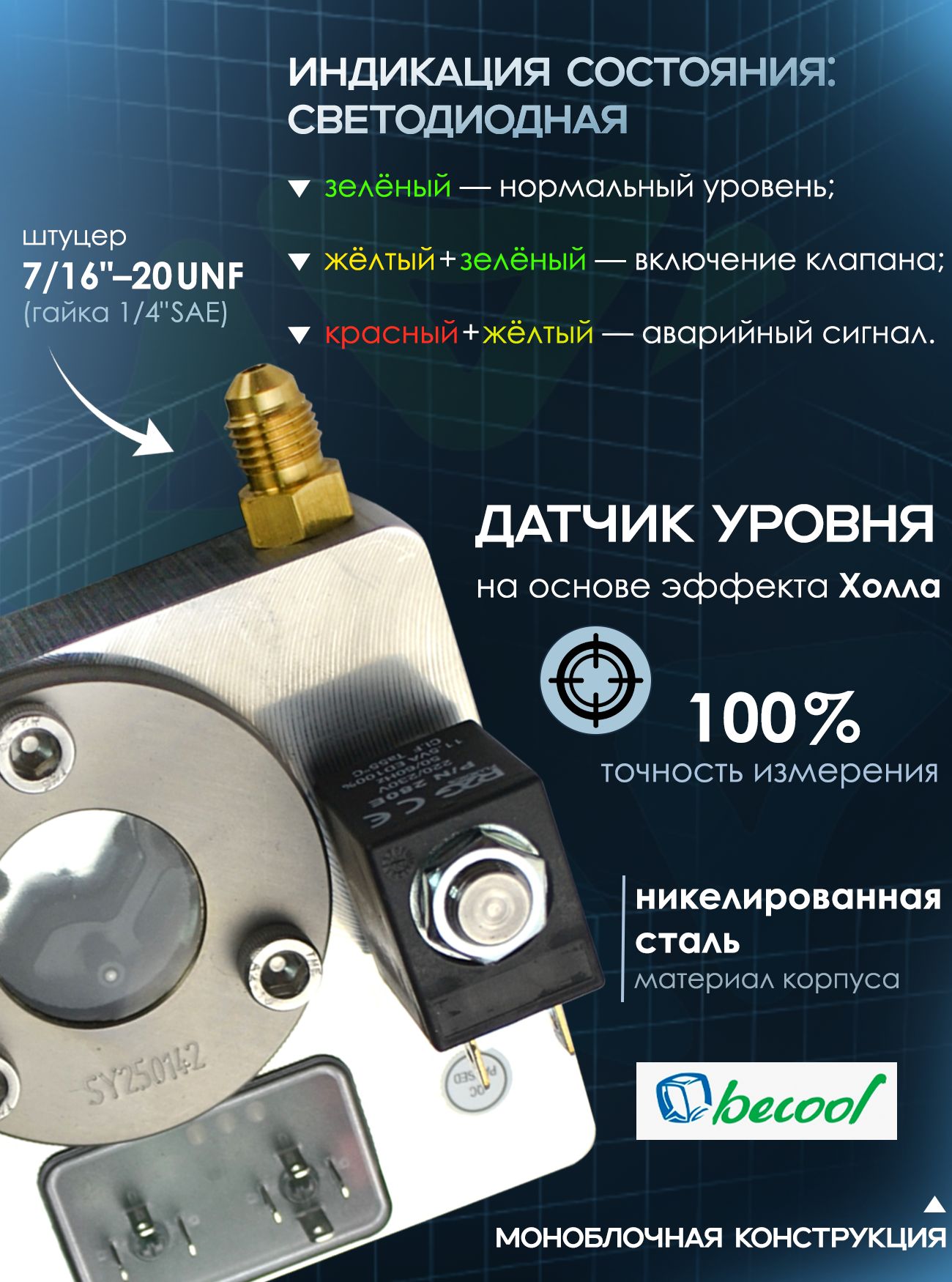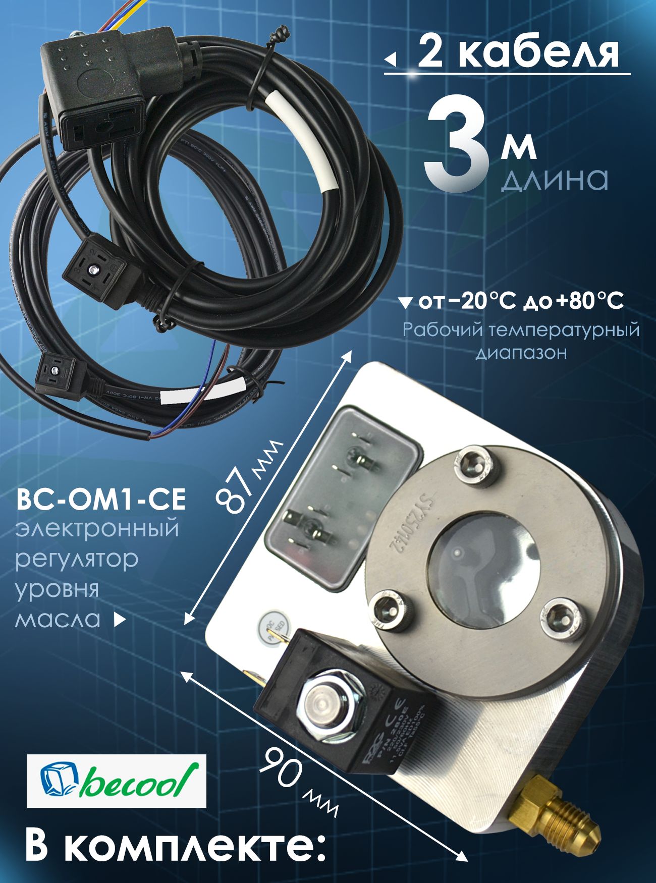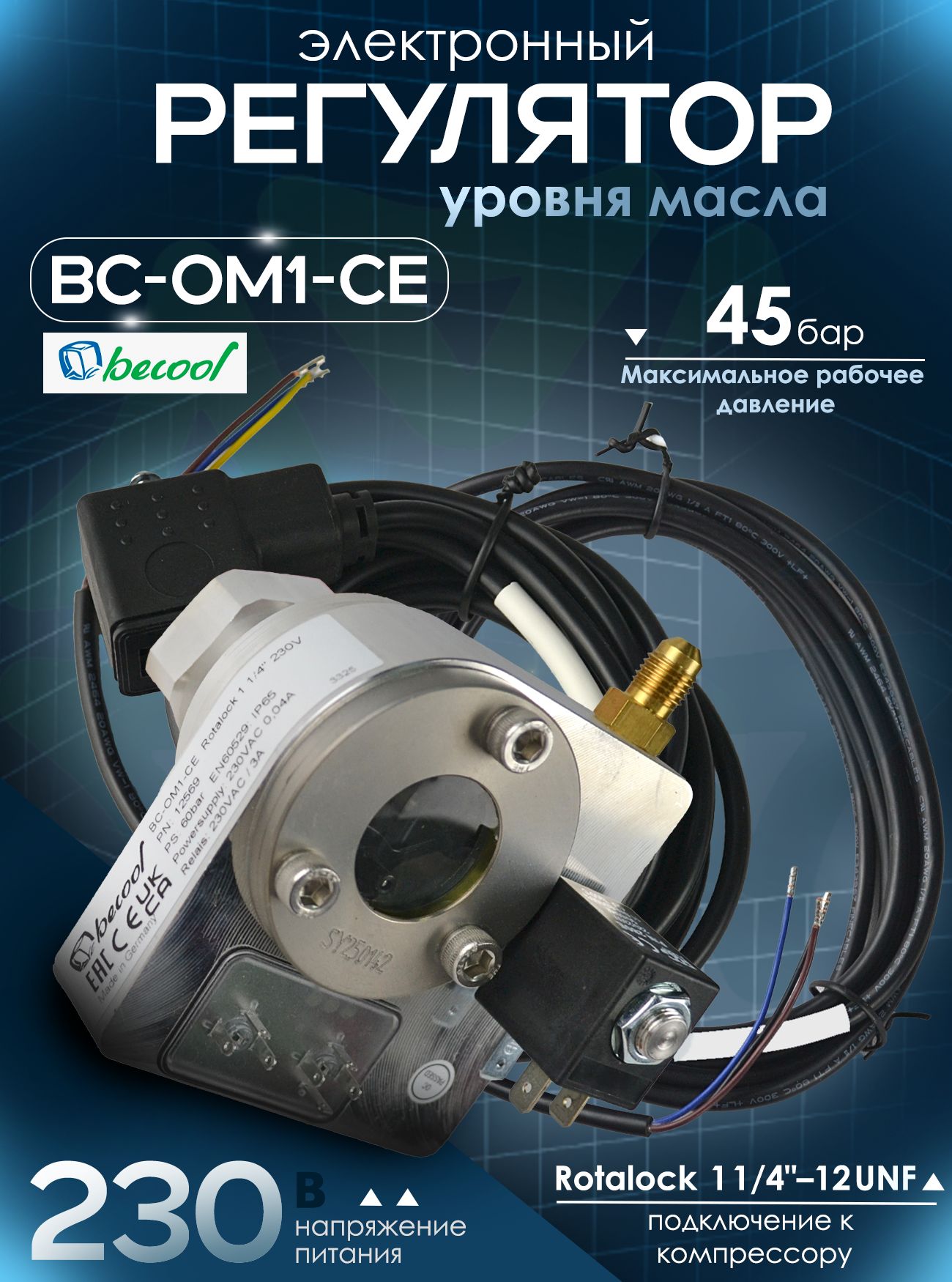 Электронный регулятор уровня масла BC-OM1-CE Rotalock 1 1/4" 230V с кабелями от компании becool — это высокотехнологичное устройство, предназначенное для автоматического контроля и поддержания оптимального уровня масла в картере холодильного компрессора. Прибор сочетает в себе функции датчика, управляющего элемента и сигнализатора, обеспечивая комплексную защиту оборудования от последствий масляного голодания или избыточного уровня смазки.