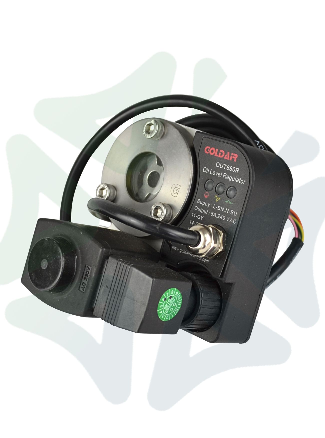Электронный регулятор уровня масла OUT680R с адаптером GOA114 (CE) 220V с кабелями 3 метра от компании Goldar — это высокотехнологичное устройство, предназначенное для автоматического контроля и поддержания оптимального уровня масла в картере холодильного компрессора. Прибор сочетает в себе функции датчика, управляющего элемента и сигнализатора, обеспечивая комплексную защиту оборудования от последствий масляного голодания или избыточного уровня смазки.