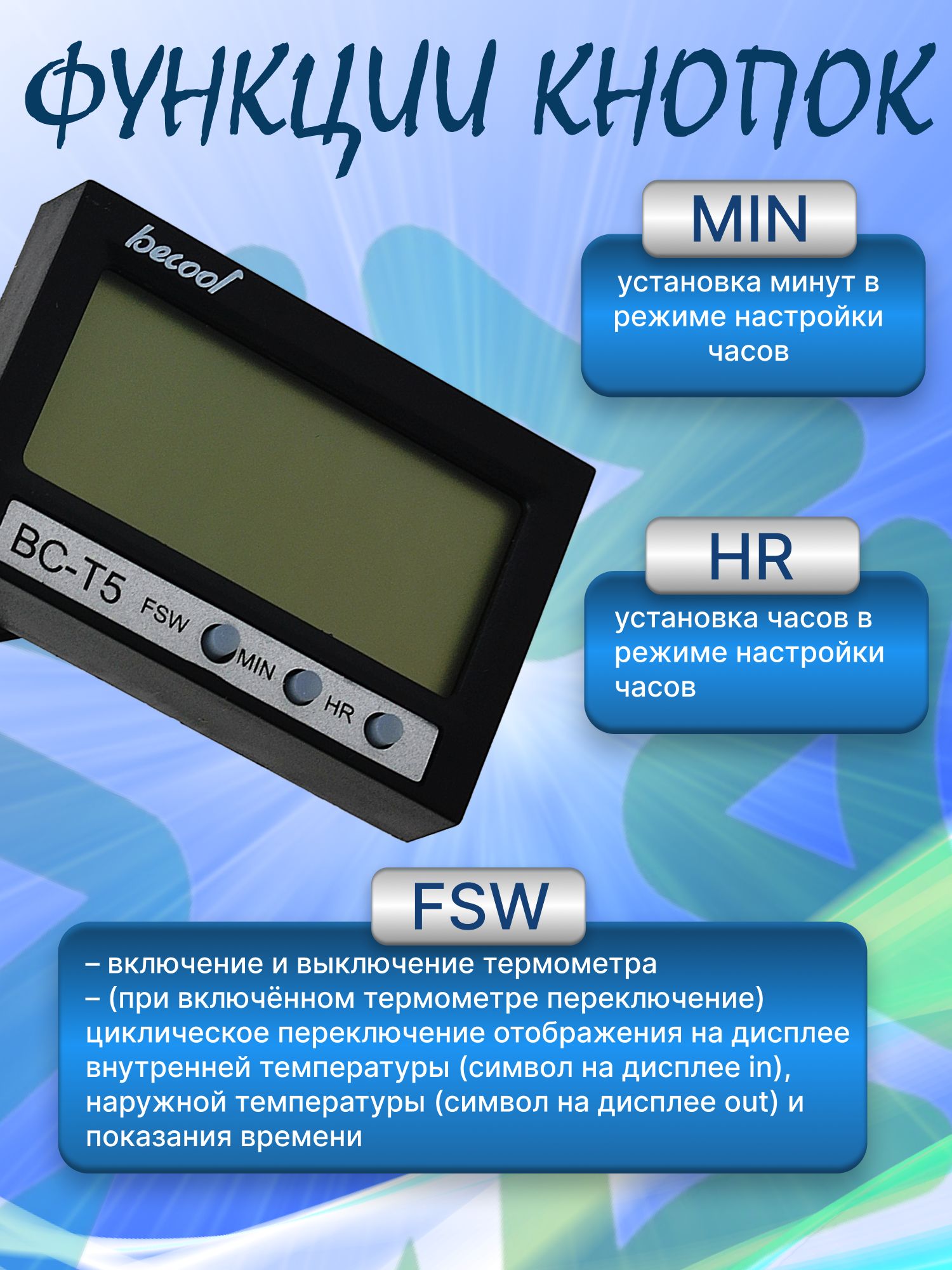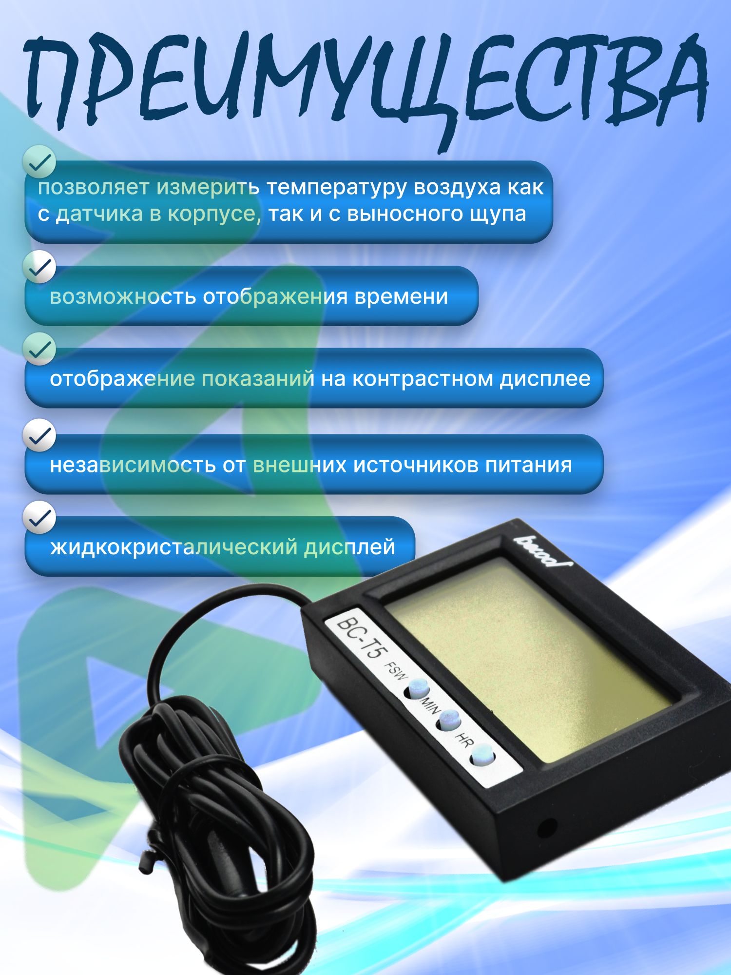 Электронный цифровой термометр BC-T5 – это универсальный и удобный инструмент от бренда Becool для измерения температуры в различных условиях. Благодаря двум датчикам, встроенному и выносному, он позволяет контролировать температуру воздуха как внутри, так и снаружи помещения, а также в труднодоступных местах. Жидкокристаллический дисплей отображает значения температуры, а также время, что делает прибор еще более функциональным.