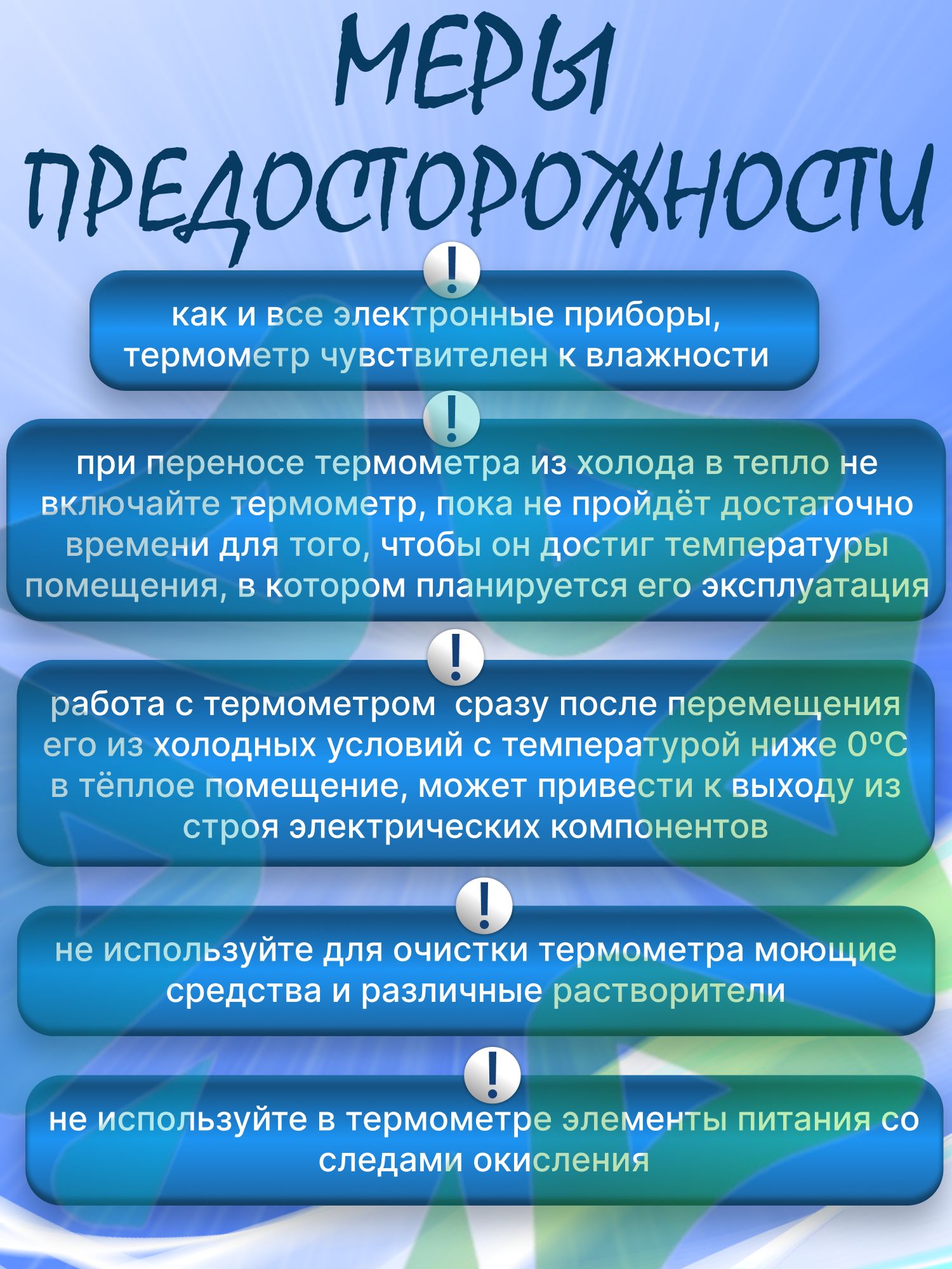 Важно помнить, что, как и все электронные приборы, термометр BC T5 чувствителен к влажности и перепадам температуры. Для обеспечения его долгой и бесперебойной работы необходимо соблюдать правила эксплуатации, избегать использования моющих средств и растворителей для очистки, а также извлекать элементы питания при длительном хранении.
