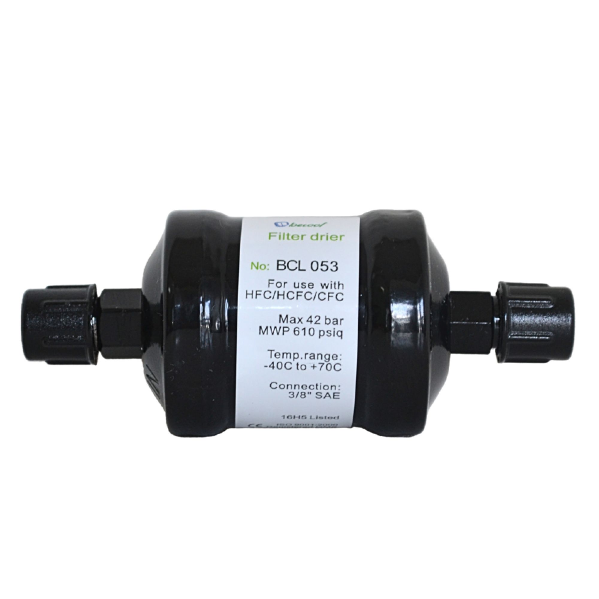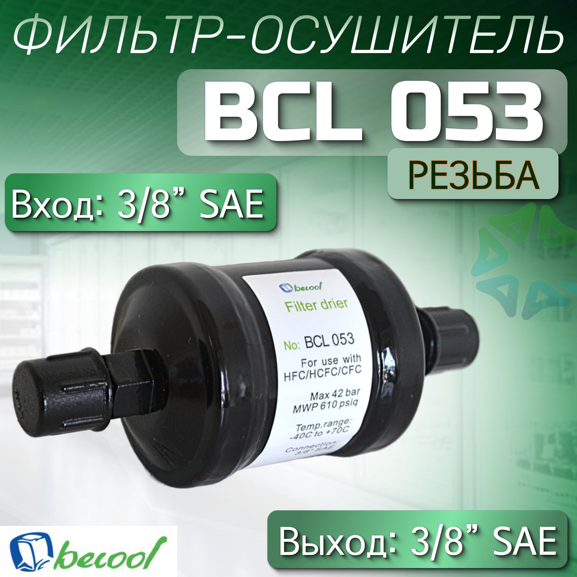 Фильтр-осушитель BCL 053 от компании Becool - используется в жидкостных трубопроводах холодильных установок и систем кондиционирования воздуха. Он предназначен для поглощения влаги и кислот, поддерживает чистоту холодильной системы и защищает металлические элементы от коррозии. Данный фильтр имеет резьбовое соединение, а вход и выход 3/8" SAE. BCL 053 имеет твёрдое ядро из молекулярного сита и активированной окиси алюминия, что позволяет ему работать даже при низком содержании влаги в хладагенте и высокой температуре жидкого хладагента. Фильтр быстро и качественно выполняет свои функции, поддерживая работу всей системы, совместим со всеми типами хладагентов, включая CFC, HCFC, HFC. Фильтр-осушитель BCL 053 — это незаменимый компонент для вашей холодильной установки или системы кондиционирования воздуха.