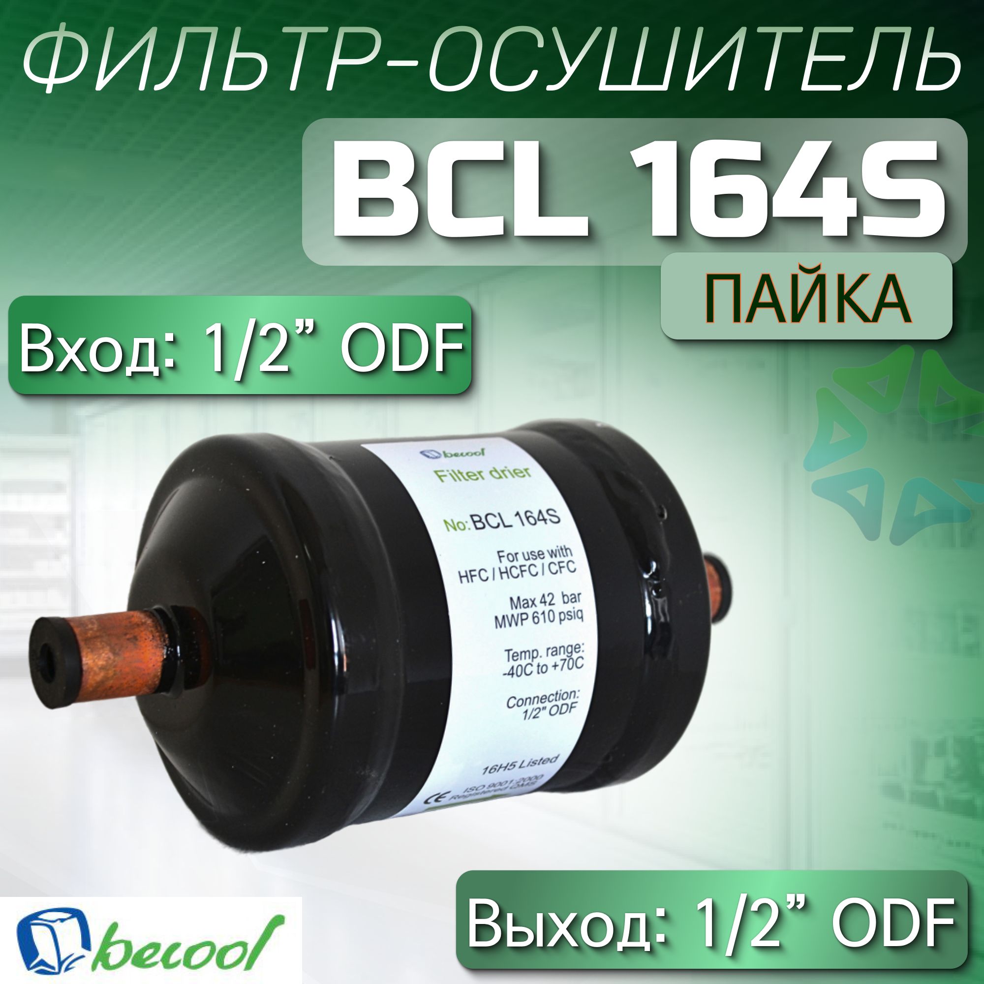 Фильтр-осушитель BCL 164S от компании Becool - используется в жидкостных трубопроводах холодильных установок и систем кондиционирования воздуха. Он предназначен для поглощения влаги и кислот, поддерживает чистоту холодильной системы и защищает металлические элементы от коррозии. Данный фильтр имеет паяное соединение, а вход и выход 1/2" ODF. BCL 164S имеет твёрдое ядро из молекулярного сита и активированной окиси алюминия, что позволяет ему работать даже при низком содержании влаги в хладагенте и высокой температуре жидкого хладагента. Фильтр быстро и качественно выполняет свои функции, поддерживая работу всей системы, совместим со всеми типами хладагентов, включая CFC, HCFC, HFC. Фильтр-осушитель BCL 164S — это незаменимый компонент для вашей холодильной установки или системы кондиционирования воздуха.