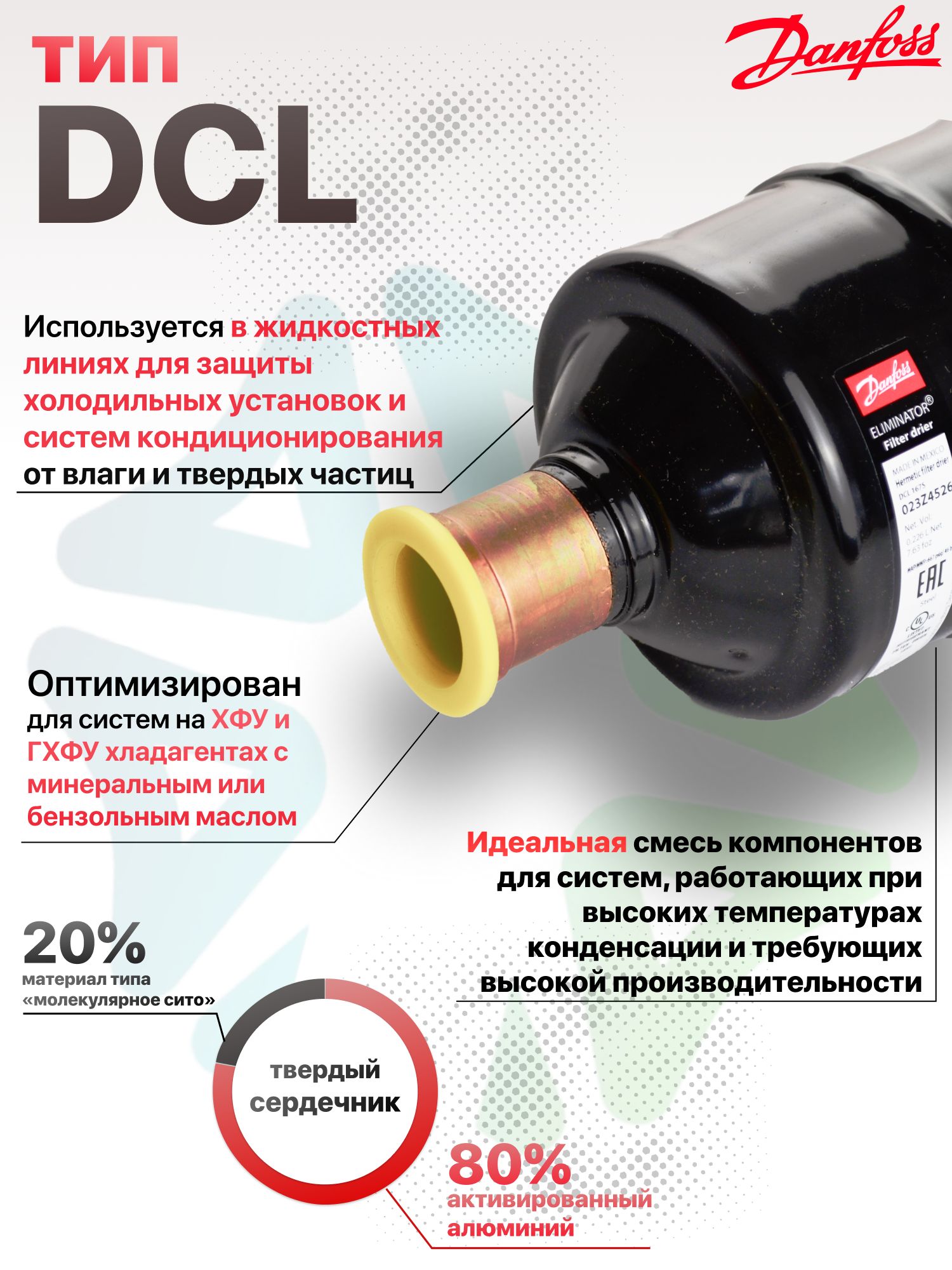 Оптимизированный для работы с ГХФУ и ХФУ хладагентами, а также минеральными и бензольными маслами, DCL 167S демонстрирует превосходную совместимость с широким спектром холодильных агентов. Сердцем фильтра является уникальная комбинация активированного алюминия (20%) и молекулярного сита (80%), обеспечивающая эффективное удаление влаги и минимизацию риска образования кислот, что критически важно для поддержания чистоты и эффективности системы.