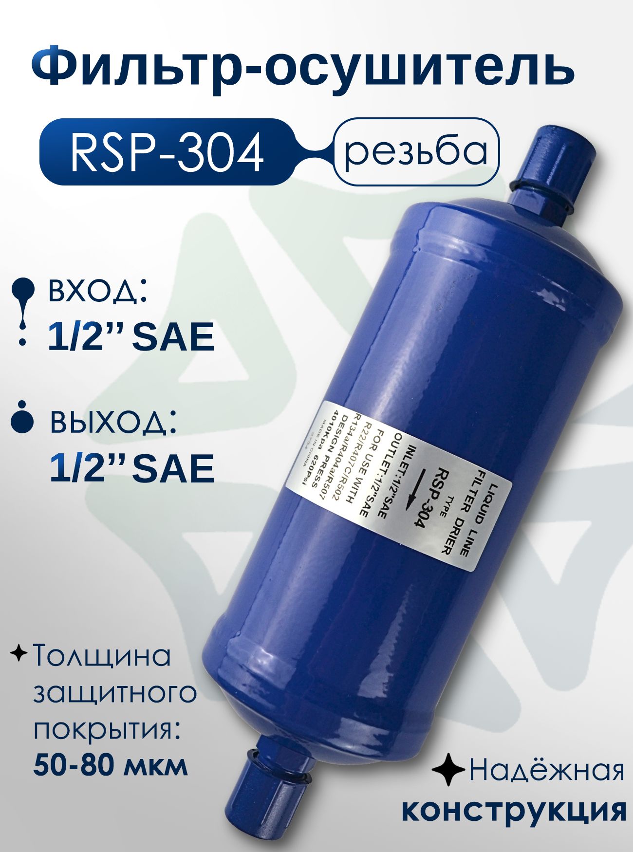 Фильтр-осушитель RSP-304 - используется в жидкостных трубопроводах холодильных установок и систем кондиционирования воздуха. Он предназначен для поглощения влаги и кислот, поддерживает чистоту холодильной системы и защищает металлические элементы от коррозии. Данный фильтр имеет резьбовое соединение, а вход и выход 1/2" SAE. RSP-304 имеет твёрдое ядро из молекулярного сита и активированной окиси алюминия, что позволяет ему работать даже при низком содержании влаги в хладагенте и высокой температуре жидкого хладагента. Фильтр быстро и качественно выполняет свои функции, поддерживая работу всей системы, совместим с типами хладагентов: