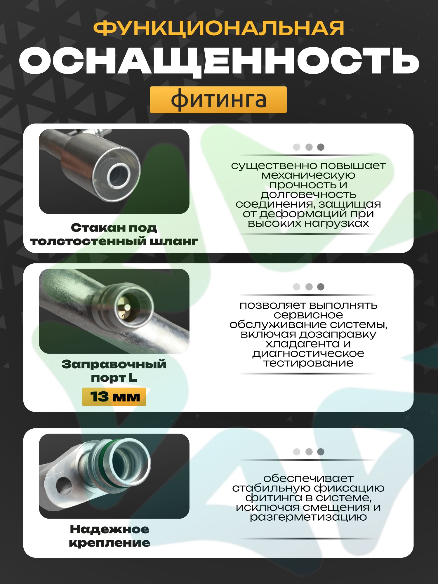 В конструкцию данного фитинга включены важные функциональные элементы: заправочный порт L (13 мм) для сервисного обслуживания (дозаправки и диагностики системы), стакан под толстостенный шланг, повышающий прочность соединения, а также крепление для надёжной фиксации.