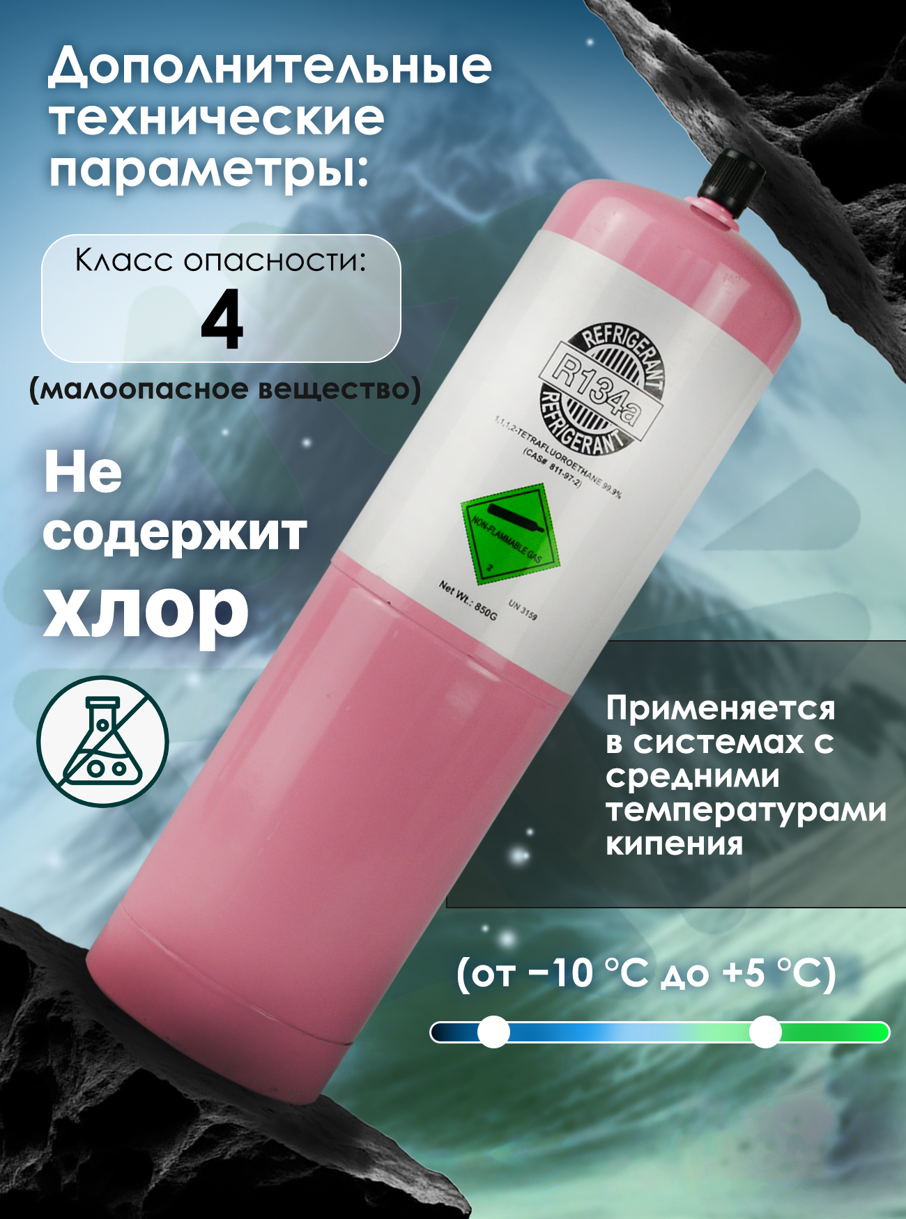 Данный фреон относится к группе гидрофторуглеродов (ГФУ/HFC), не содержащих хлора — благодаря этому его озоноразрушающий потенциал (ODP) равен нулю. Хладагент R134A отличается низкой токсичностью и негорючестью, что существенно повышает безопасность его эксплуатации в бытовых и промышленных условиях. Фреон R134A совместим преимущественно с синтетическими полиэфирными маслами (POE) и (PAG), что необходимо учитывать при обслуживании оборудования.