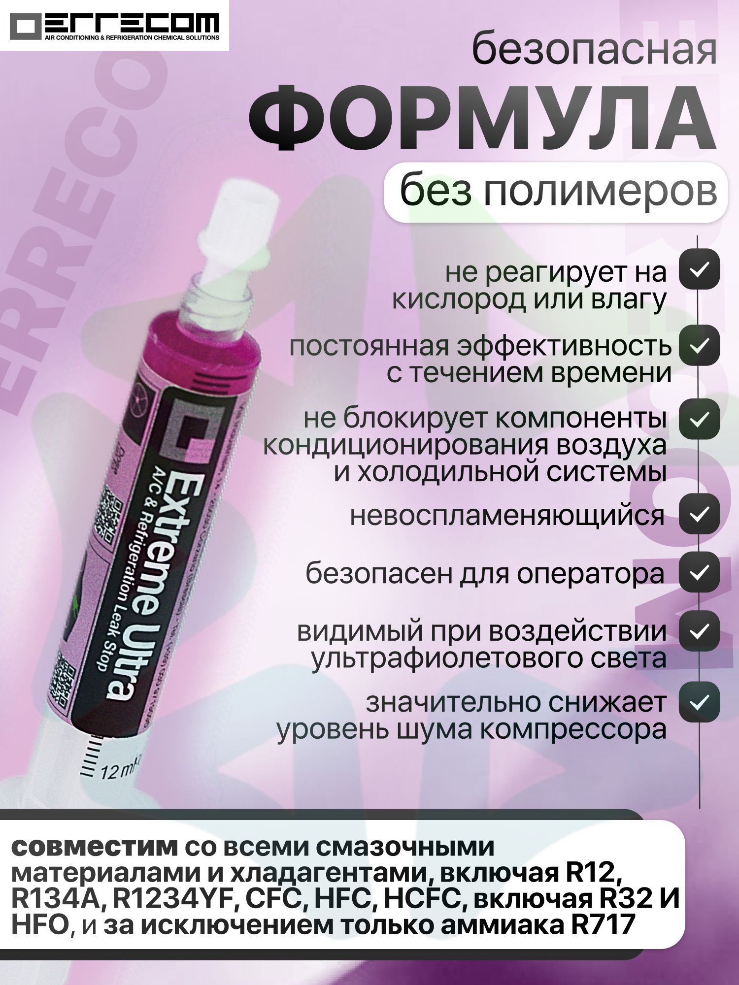 Extreme Ultra от Errecom — это инновационное решение для быстрого и эффективного устранения микроутечек фреона в системах кондиционирования и охлаждения. Этот герметик разработан специально для борьбы с проблемой утечек, не превышающих 0,3 мм, и подходит для использования в широком спектре оборудования, включая автомобильные кондиционеры (в том числе гибридные и электрические модели), холодильные установки и промышленные системы кондиционирования. Уникальная формула Extreme Ultra обеспечивает надежную герметизацию как металлических, так и резиновых компонентов системы, создавая перманентный барьер против утечек фреона.