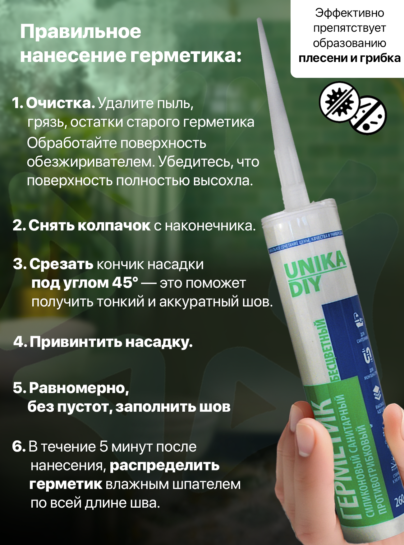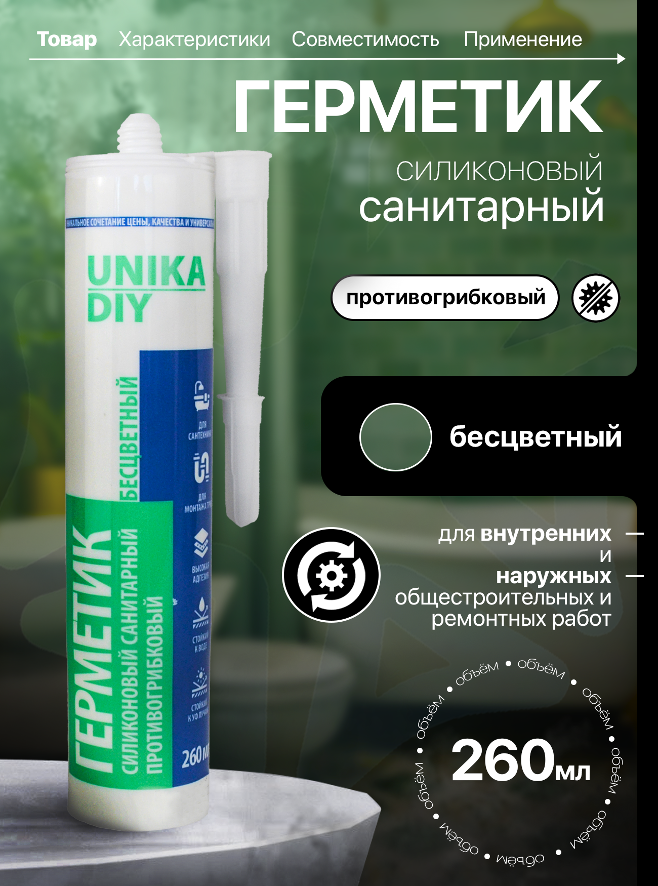 Герметик силиконовый санитарный противогрибковый, бесцветный - это однокомпонентный состав кислотного отверждения для внутренних и наружных общестроительных и ремонтных работ. Продукт содержит повышенное количество антигрибковых добавок, что делает его оптимальным для помещений с повышенной влажностью: ванных комнат, кухонь, душевых, санузлов и бассейнов. Герметик обеспечивает надёжную герметизацию швов и стыков, защищает от появления плесени и грибка.
