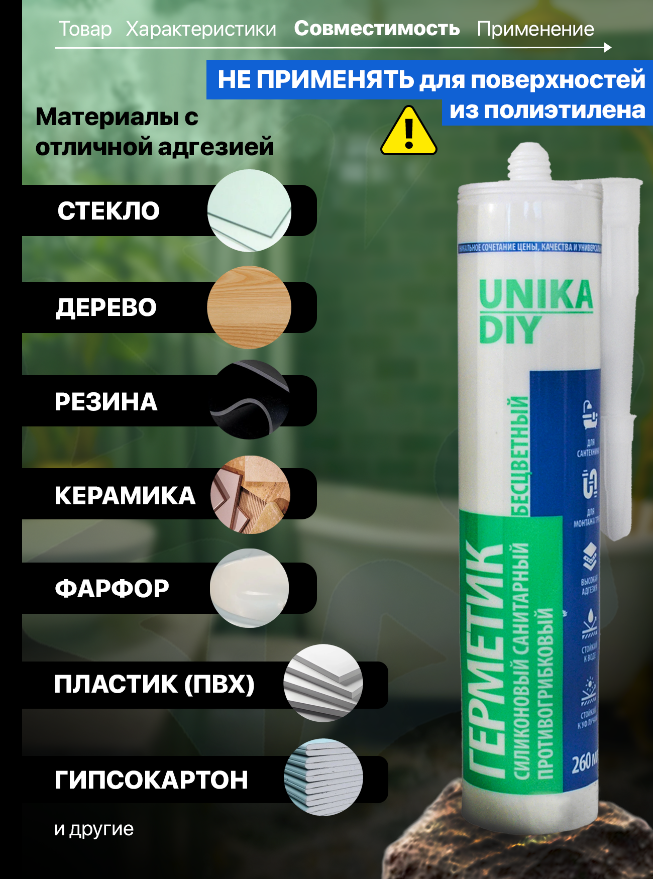 Обладает отличной адгезией к широкому спектру материалов, включая керамику, фарфор, стекло, пластик, резину и древесину. Легко заполняет щели и швы без усадки, сохраняет эластичность после затвердевания (растяжение до 200 %) и обеспечивает герметичность при деформациях конструкций.