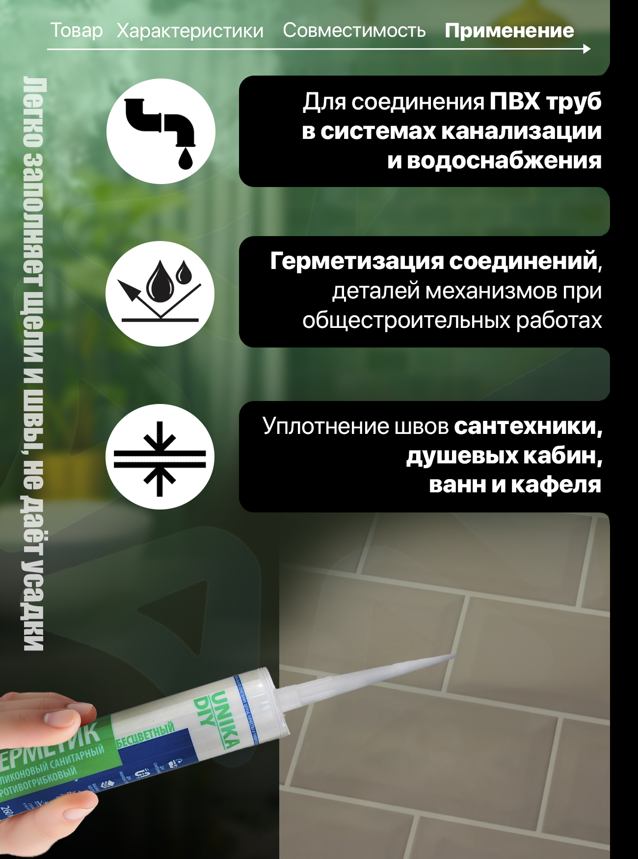 - используется для заполнения трещин, щелей и деформационных швов, создания эластичных соединений в конструкциях, подверженных температурным и механическим деформациям, в т. ч. при ремонте душевых уголков, стеклянных перегородок и облицовки;