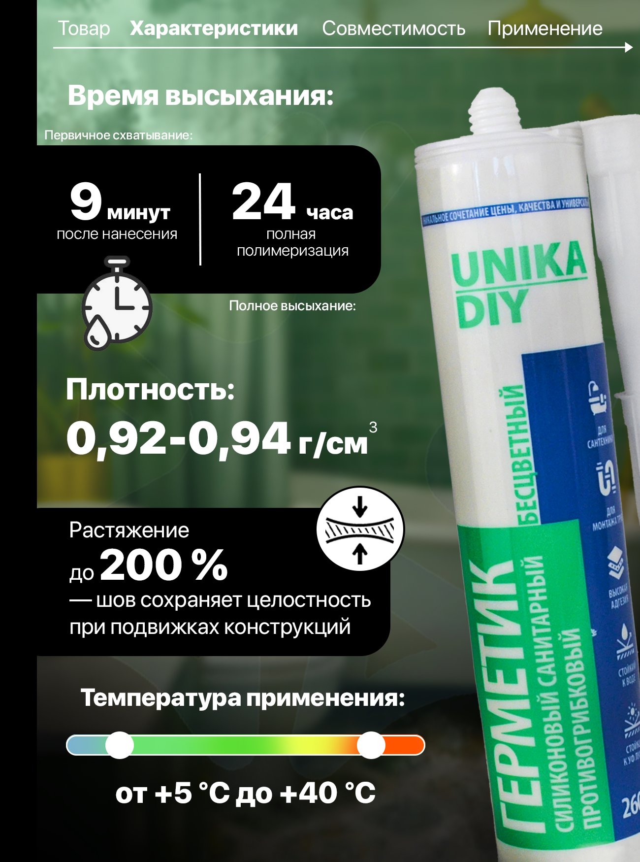 Плотность состава — 0,93 г/см3, что обеспечивает оптимальный баланс между эластичностью и прочностью шва. Бесцветный состав создаёт незаметный шов, сохраняя эстетичный вид поверхностей.