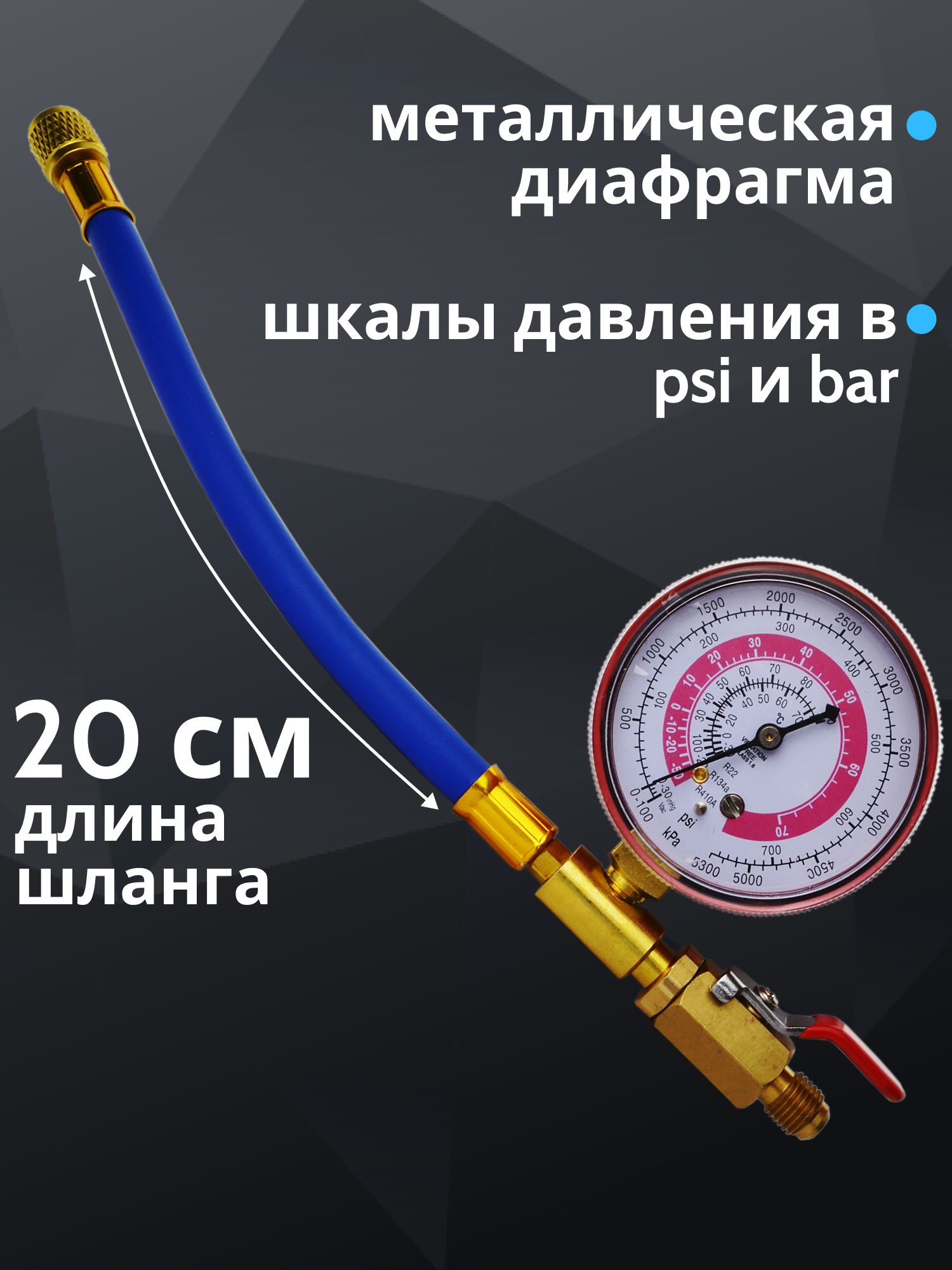 Коллектор LT-BG001 применяется для измерения давления в системе автокондиционера, работающего на хладагентах: R22/ R134a/ R410A . Устройство с металлической диафрагмой представляет собой манометрический коллектор со шлангом. Шкалы давления в psi и bar, в начале каждой шкалы указывается марка хладагента, для которого она предназначена. Подключение - 1/4 SAE.