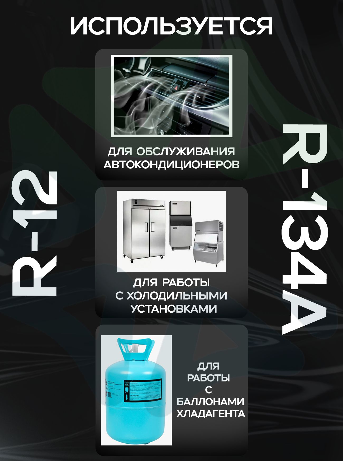 Комплект совместим с системами, работающими на хладагентах R‑12 и R‑134a. Эти фреоны широко применяются в автомобильных кондиционерах разных поколений, что делает CH‑135 актуальным как для обслуживания старых, так и новых моделей. Адаптеры рассчитаны на рабочее давление, характерное для стандартных заправочных систем, что гарантирует безопасность операций по заправке, вакуумированию и диагностике герметичности контура.