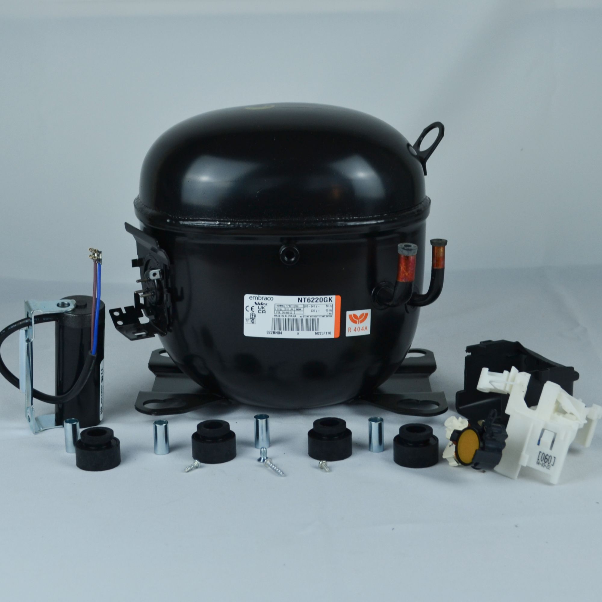 Компрессор NT6220GK (MBP) с пусковым конденсатором - это надежный герметичный поршневой агрегат от бренда EMBRACO ASPERA для коммерческого холодильного оборудования. Данный компрессор является среднетемпературным (MBP). NT6220GK работает с хладагентом R404a.
