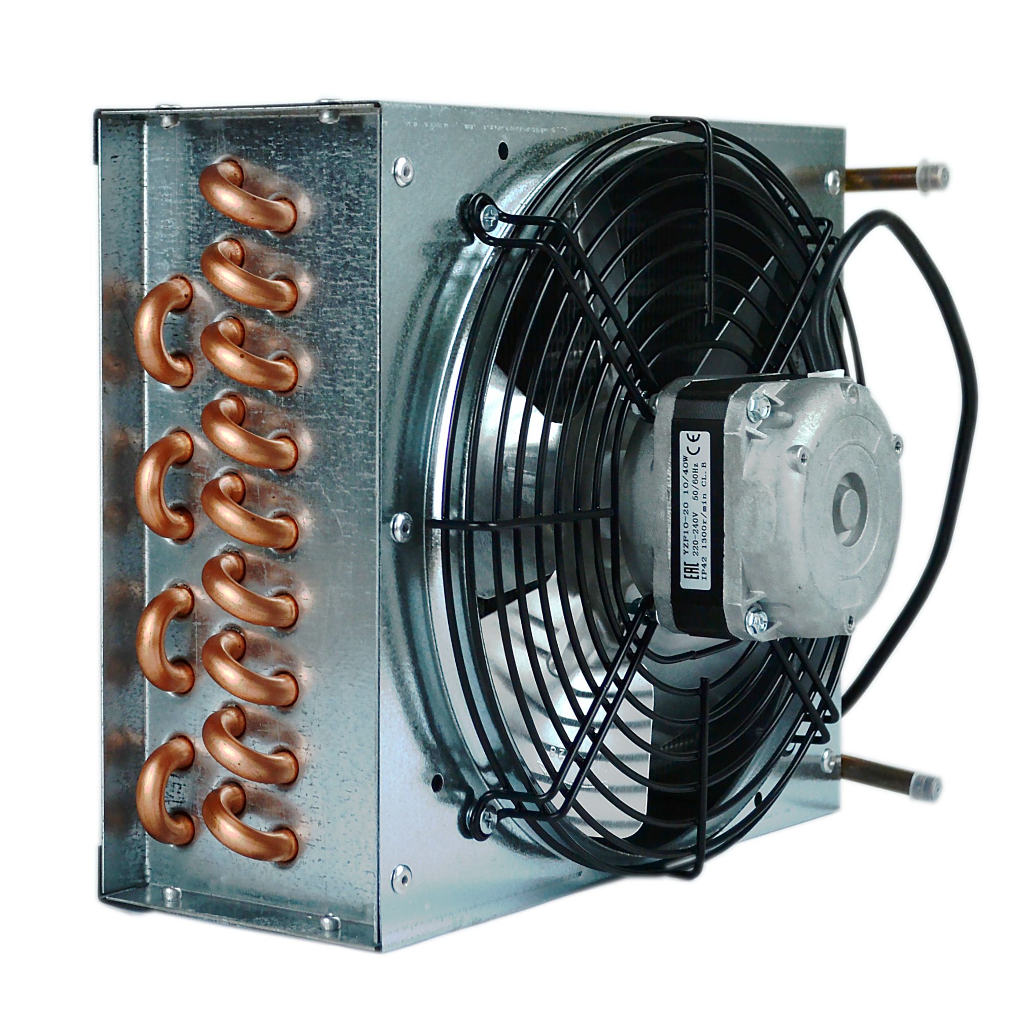 Данный конденсатор продается в сборе с двигателем вентилятора 10-20, крыльчаткой 230 мм и решеткой. Модель данного класса относится к однофазным микродвигателям с расщепленными полюсами и начитывает 4 полюса.Напряжение питания составляет 220В/50 Гц, а скорость вращения - 1300 об/мин. Диапазон рабочих температур данного микродвигателя варьируется от -30 до +50 °C.