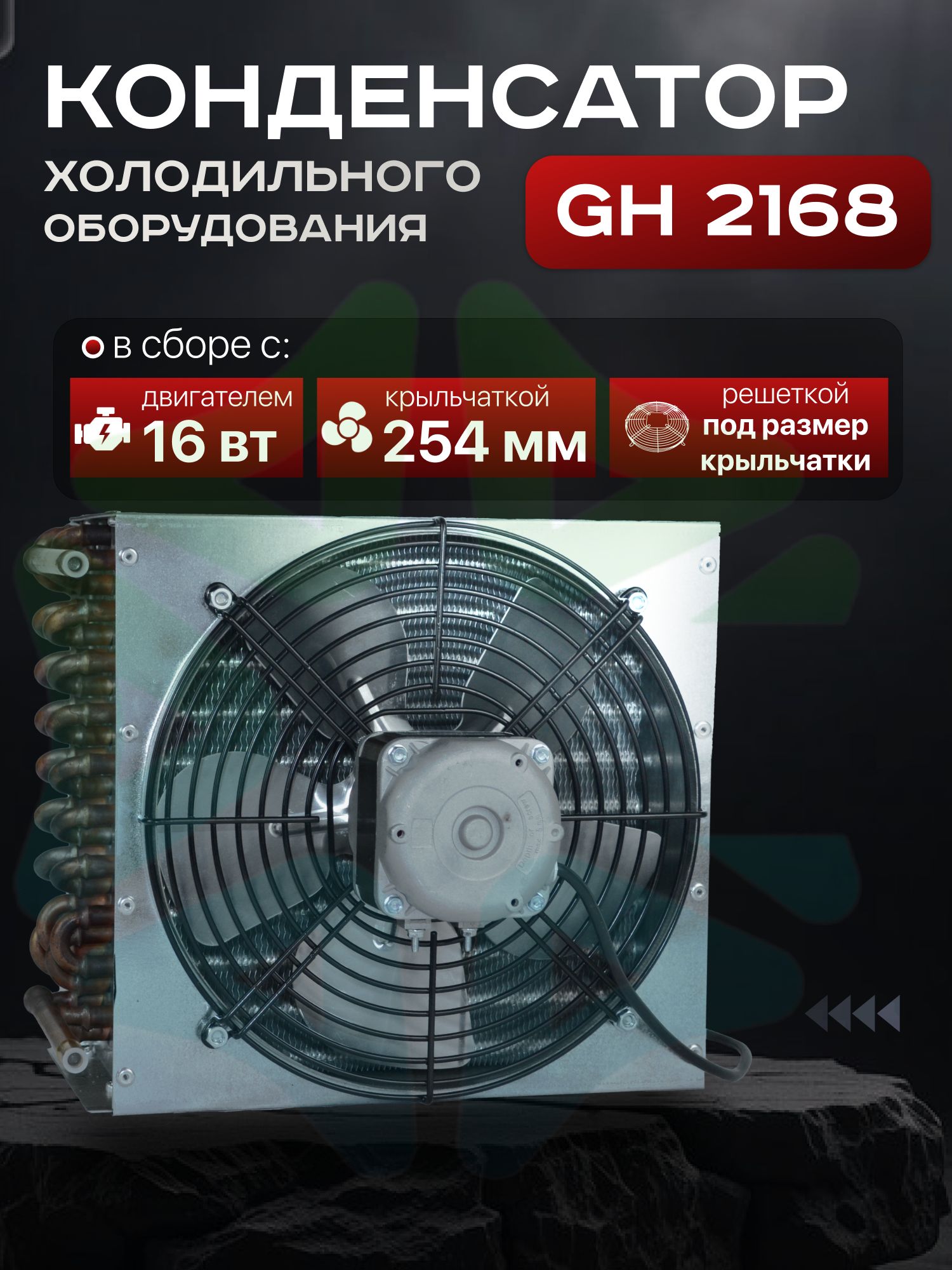 Комплектация конденсатора включает решетку, которая обеспечивает защиту вентилятора от механических повреждений и посторонних предметов, сохраняя при этом эффективность воздушного потока. Простота монтажа и обслуживания делает GH 2168 удобным решением как для новых систем, так и для модернизации существующих.