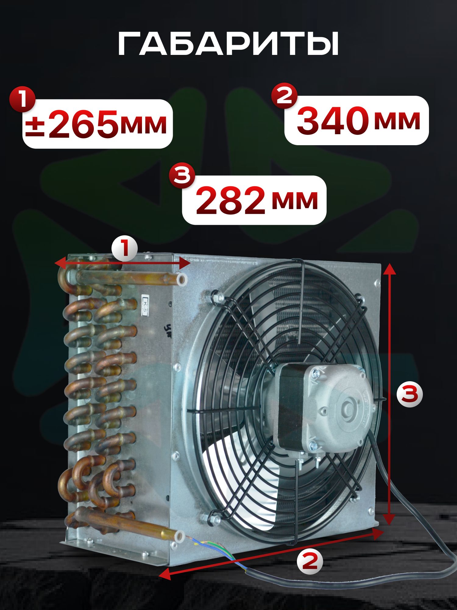 - Размеры конденсатора: длина-340 мм, ширина- ±265 мм (с учетом двигателя и решетки), ширина - 188 мм (без двигателя и решетки), высота - 282 мм.