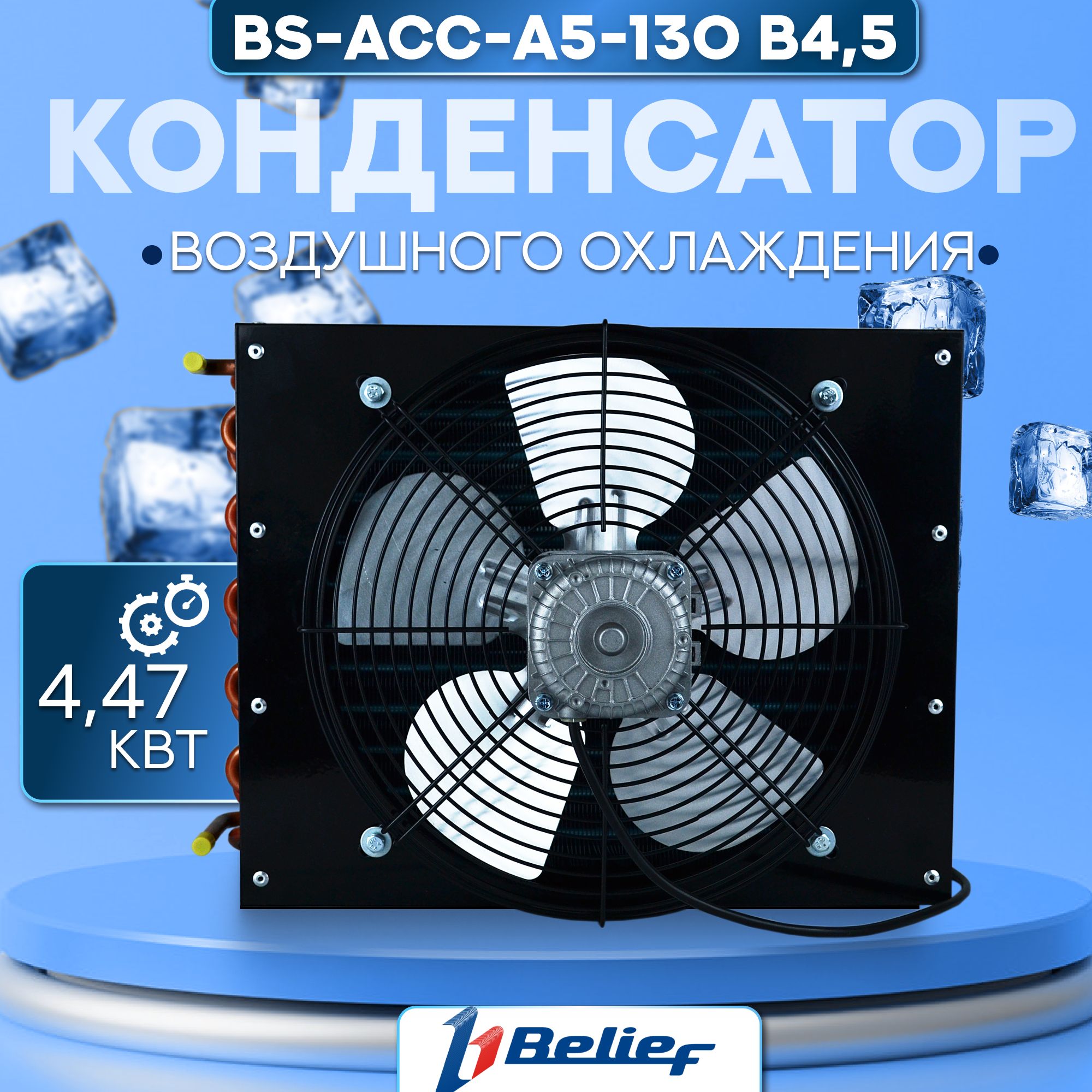 Конденсатор воздушного охлаждения холодильного оборудования BS-ACC-A5-130 B4,5 в сборе с вентилятором представляет собой блок вентиляции с электродвигателем и теплообменником.