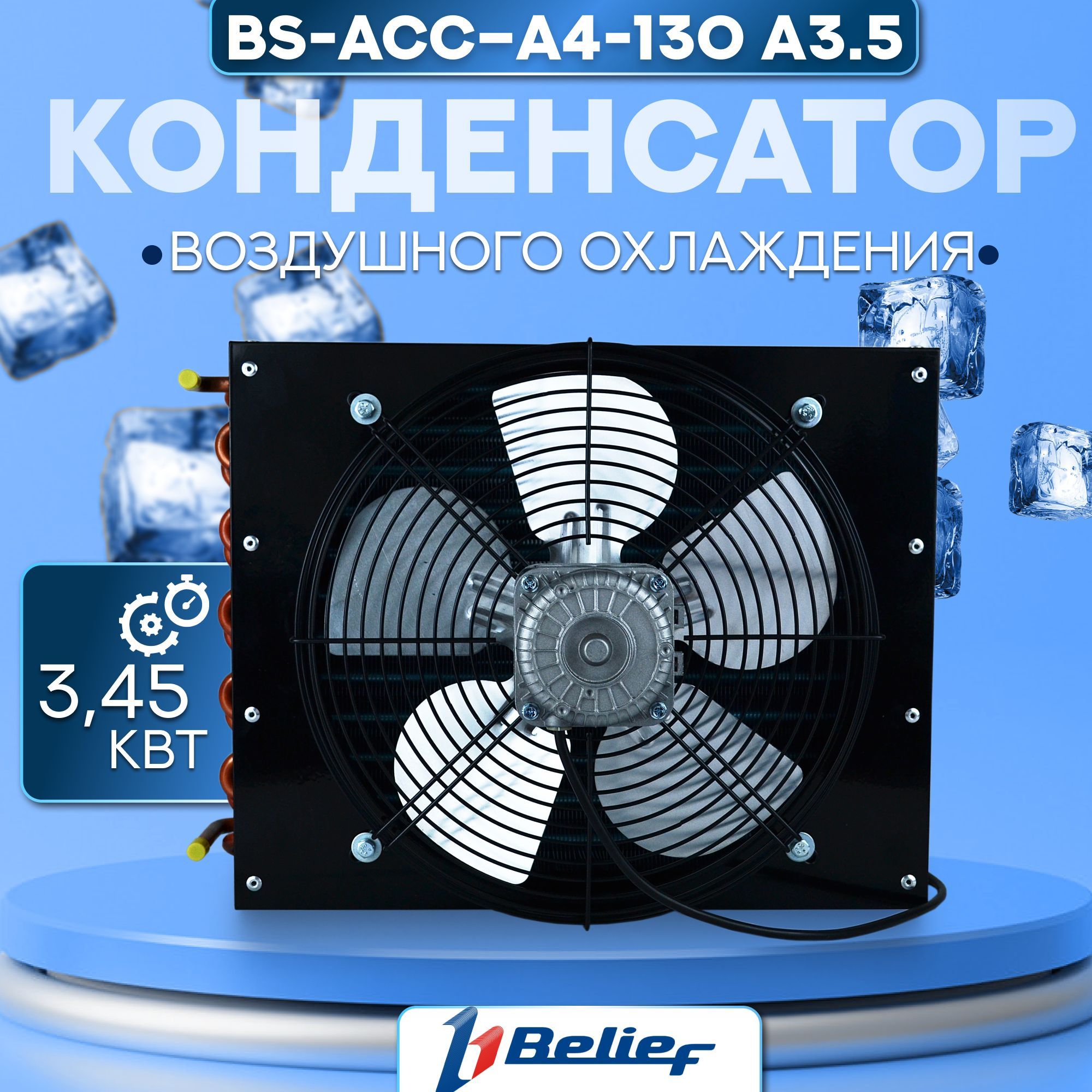 Конденсатор воздушного охлаждения холодильного оборудования BS-ACС–A4-130 А3.5 в сборе с вентилятором представляет собой блок вентиляции с электродвигателем и теплообменником.