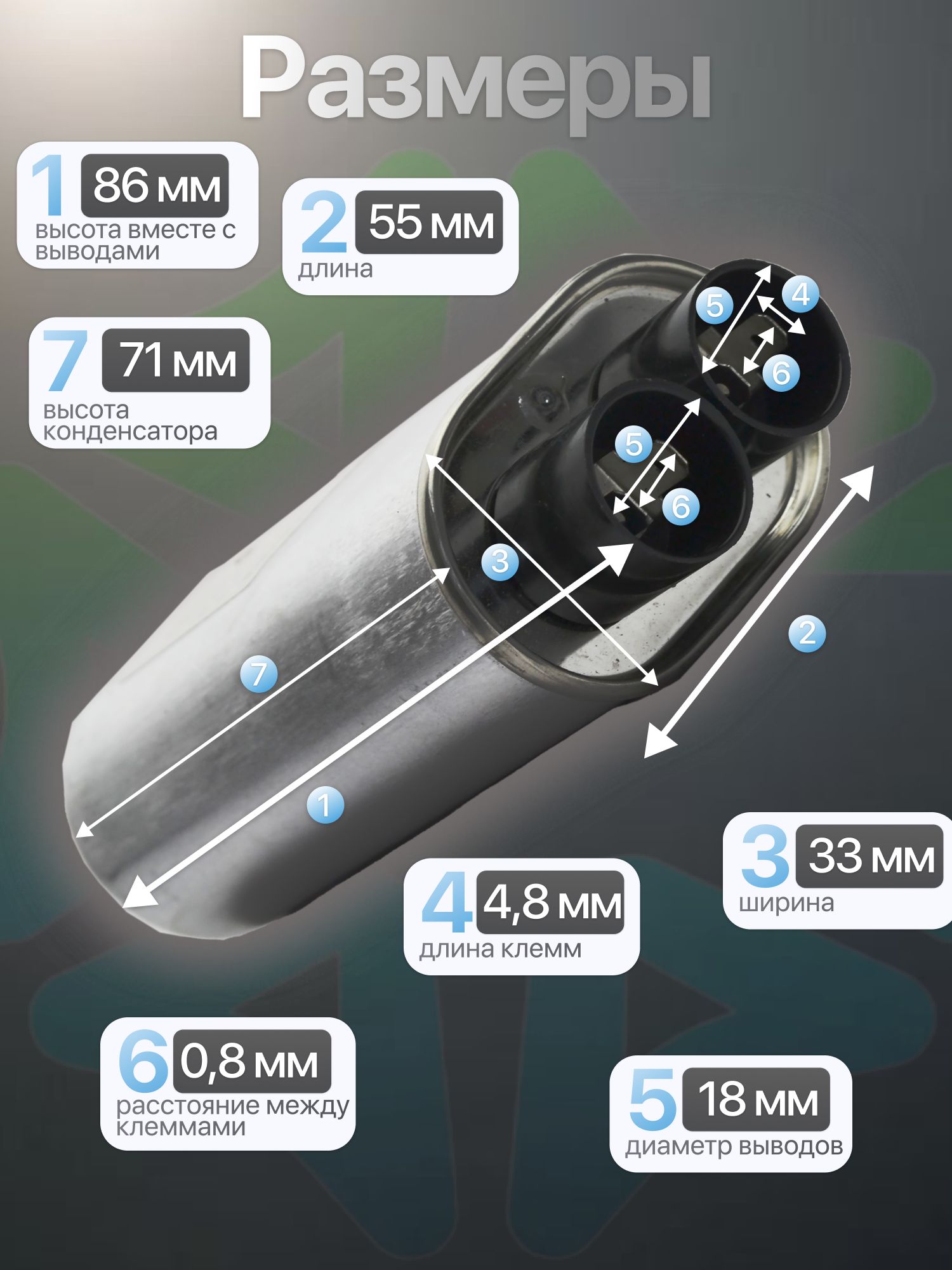 Удобство подключения обеспечивается двумя колодками с двумя контактами каждая, а ножевые клеммы размером 4,8×0,8 мм обеспечивают надежное и простое соединение. Корпус, выполненный из прочного металла, гарантирует долговечность и устойчивость к внешним воздействиям, а широкий диапазон рабочих температур от -10 до +85 °С позволяет использовать конденсатор в различных условиях эксплуатации.