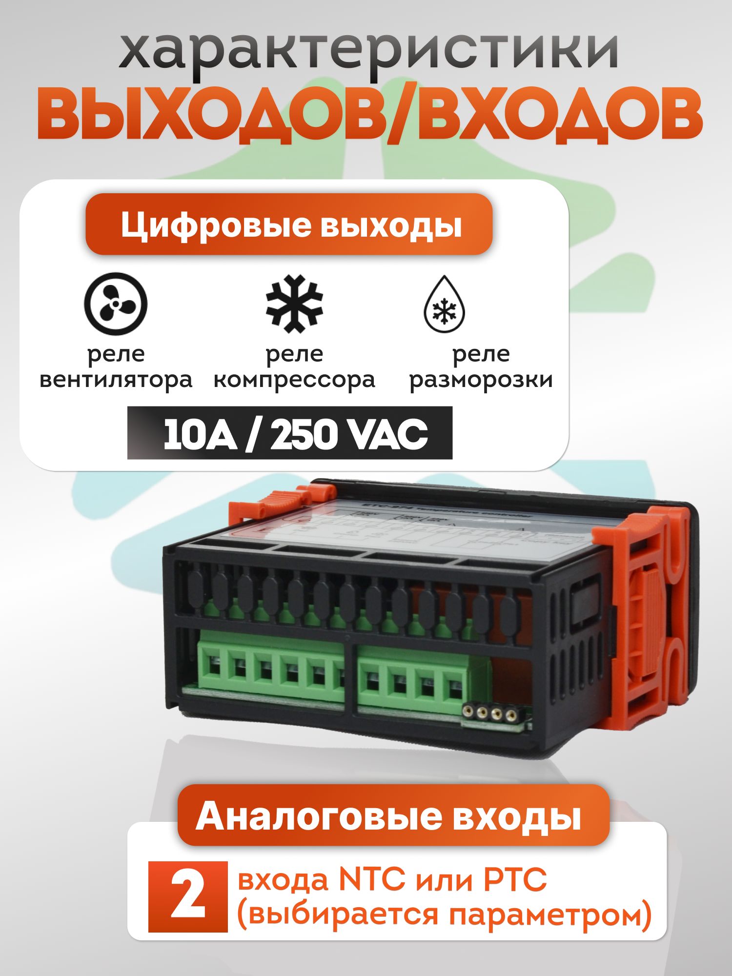 Контроллер ETC-974 совместим с датчиками NTC и PTC (выбор типа датчика настраивается параметром), что делает его универсальным решением для различных типов холодильного оборудования. Он оснащен реле для управления компрессором, вентилятором и разморозкой с коммутационной способностью 10А/250VAC, что обеспечивает надежное и безопасное управление подключенными устройствами.