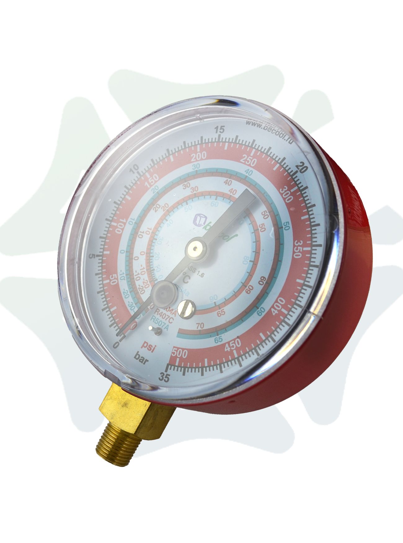 Универсальность применения достигается благодаря совместимости с различными типами хладагентов: R134a, R404A, R407C и R507A. На шкале прибора нанесены температурные отметки для каждого из этих фреонов, что позволяет одновременно контролировать как давление, так и температуру в системе.