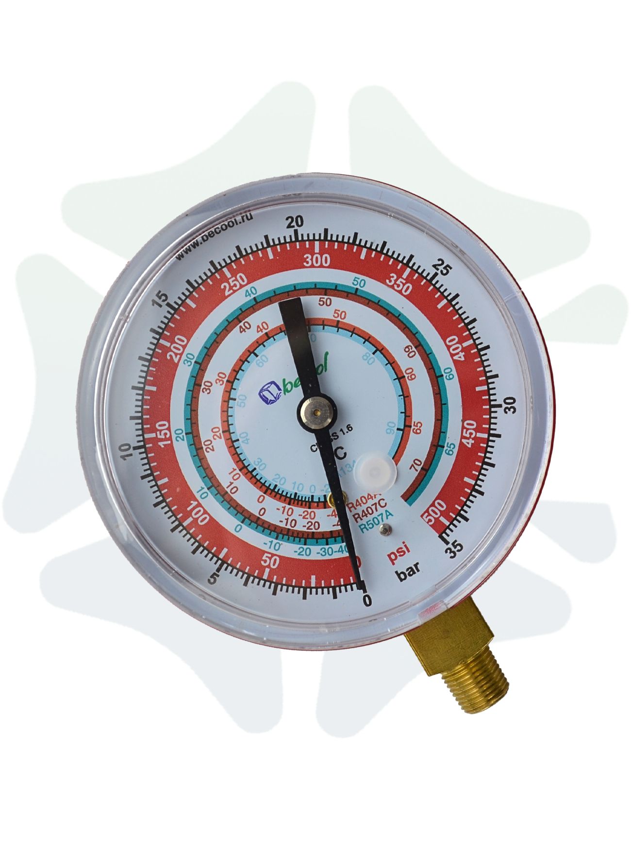 Прибор оснащен двусторонней шкалой с градуировкой в единицах измерения Psi и Bar, что обеспечивает удобство использования в различных условиях. Диапазон измерений от -1 до 34 бар позволяет применять манометр для решения практически любых задач, связанных с контролем давления в холодильных системах.