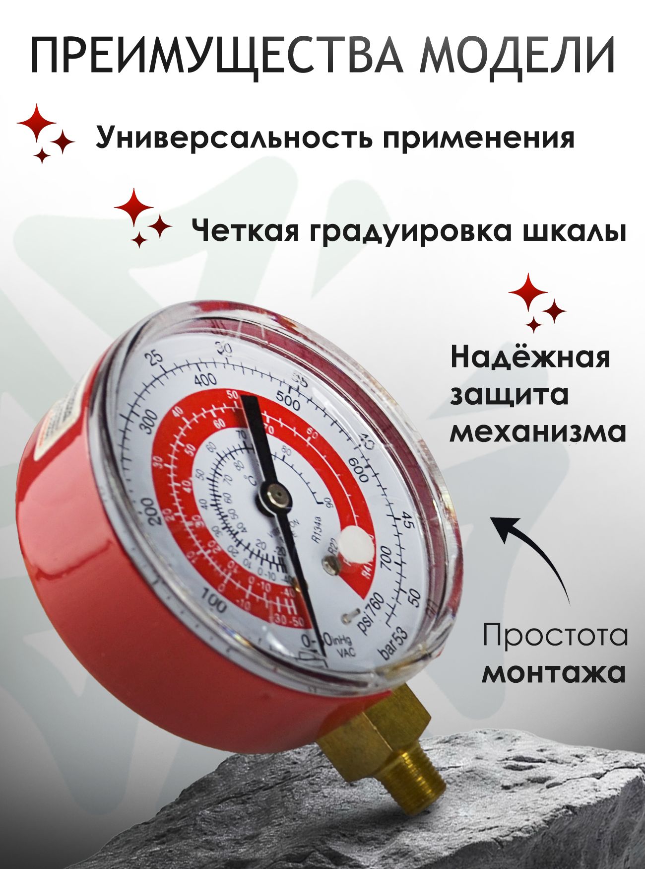 Универсальность применения достигается благодаря совместимости с различными типами хладагентов: R134a, R22, R407C и R410A. На шкале прибора нанесены температурные отметки для каждого из этих фреонов, что позволяет одновременно контролировать как давление, так и температуру в системе.