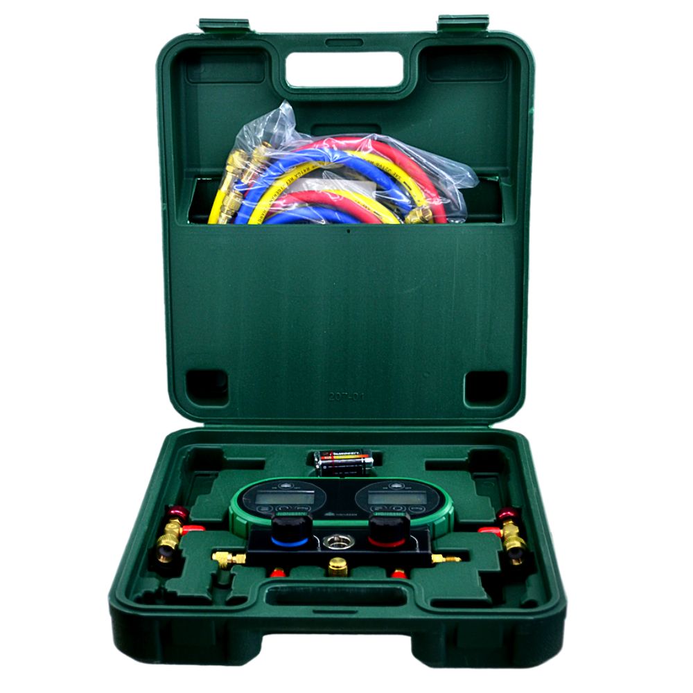 Манометрическая станция HS-DVS60-101A от бренда Hongsen - это высокоточный инструмент, предназначенный для измерения давления и вакуума в холодильных системах, работающих на хладагентах: R404A, R600A, R134a, R1234yf, R22, R407C, R32, R410A, R507A. Данная манометрическая станция представляет собой кейс, состоящий из двухвентильного манометрического коллектора со стальным крюком для крепления, двух серверных вентилей, двух батареек и трёх зарядных шлангов длинной по 1,5 метра. Шкалы давления в psi и bar, в начале каждой шкалы указывается марка хладагента, для которого она предназначена. Станция обладает высокой точностью измерений и широким диапазоном. Она также проста в использовании и обслуживании, имеет прочный корпус и изготовлена из качественных материалов, обеспечивающих надежность и долговечность.
