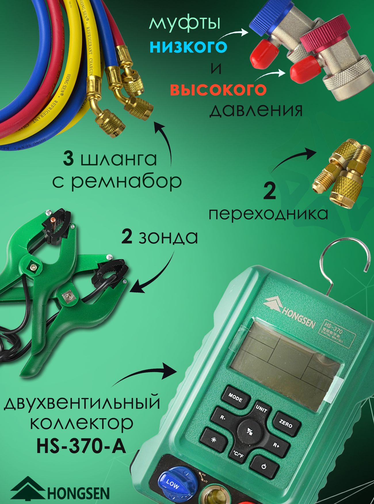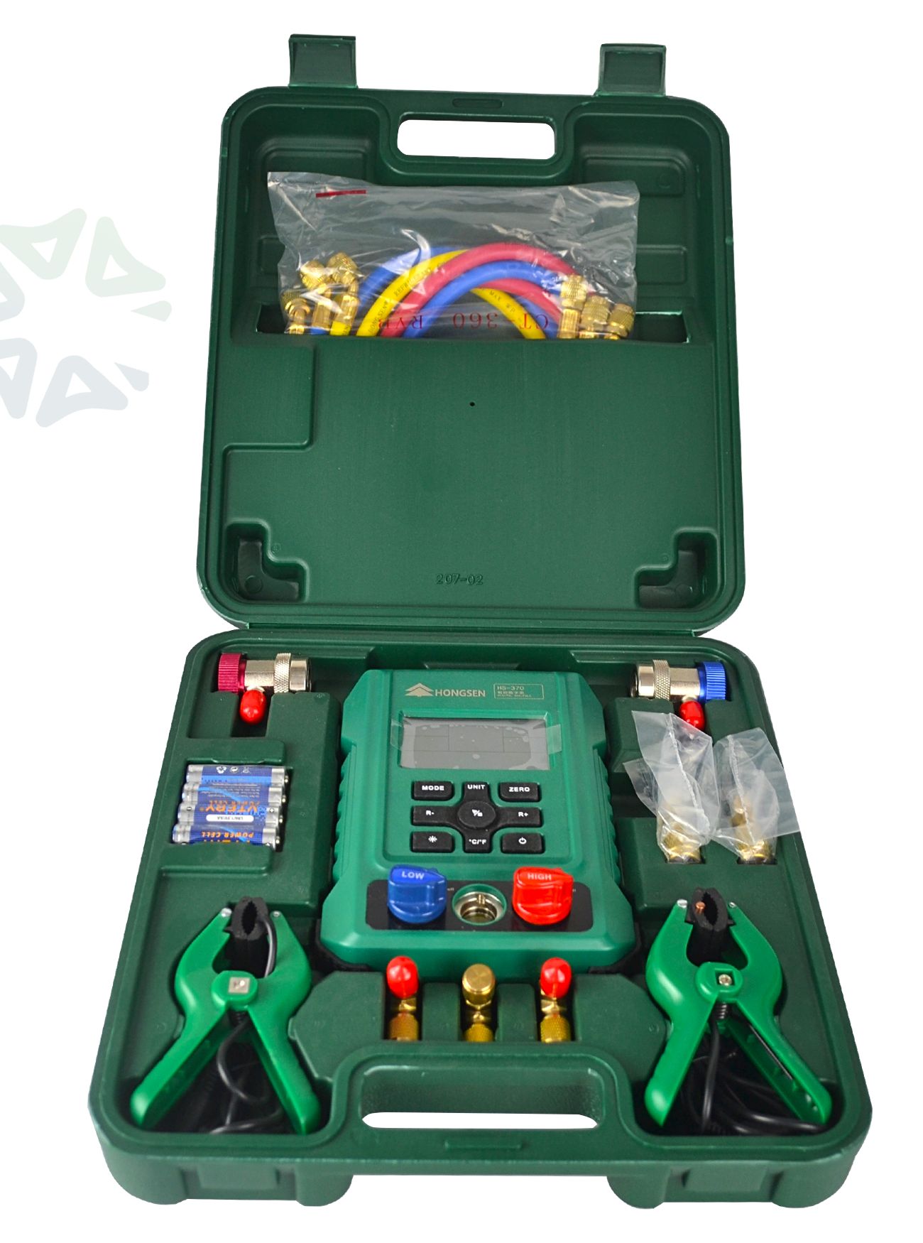 Манометрическая цифровая станция HS-370-A от бренда Hongsen - представляет собой высокотехнологичный инструмент для диагностики и обслуживания холодильных систем. Манометрическая станция HS-370-A представляет собой двухвентильный цифровой манометрический коллектор с металлической диафрагмой и двумя зондами. В комплект входят: