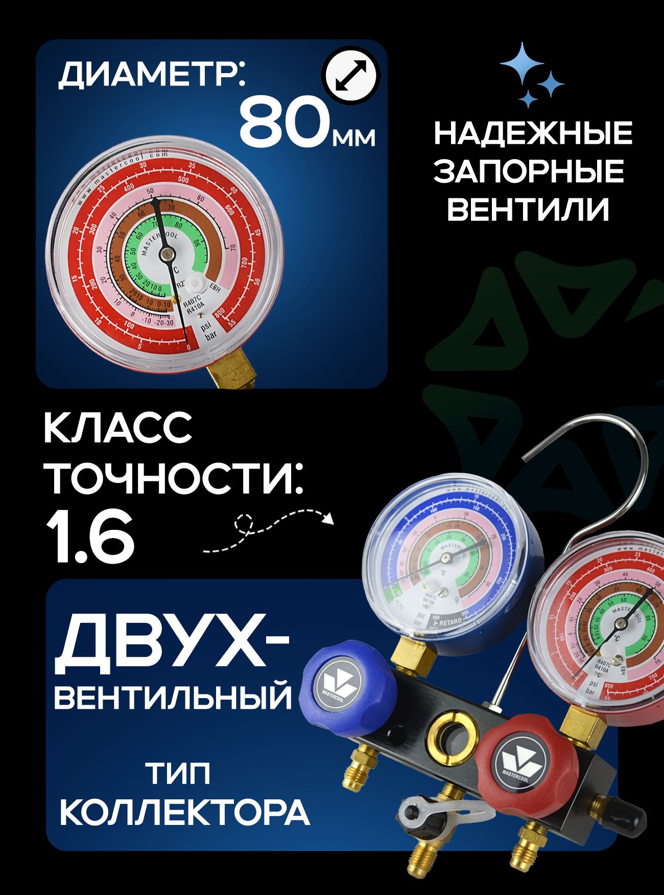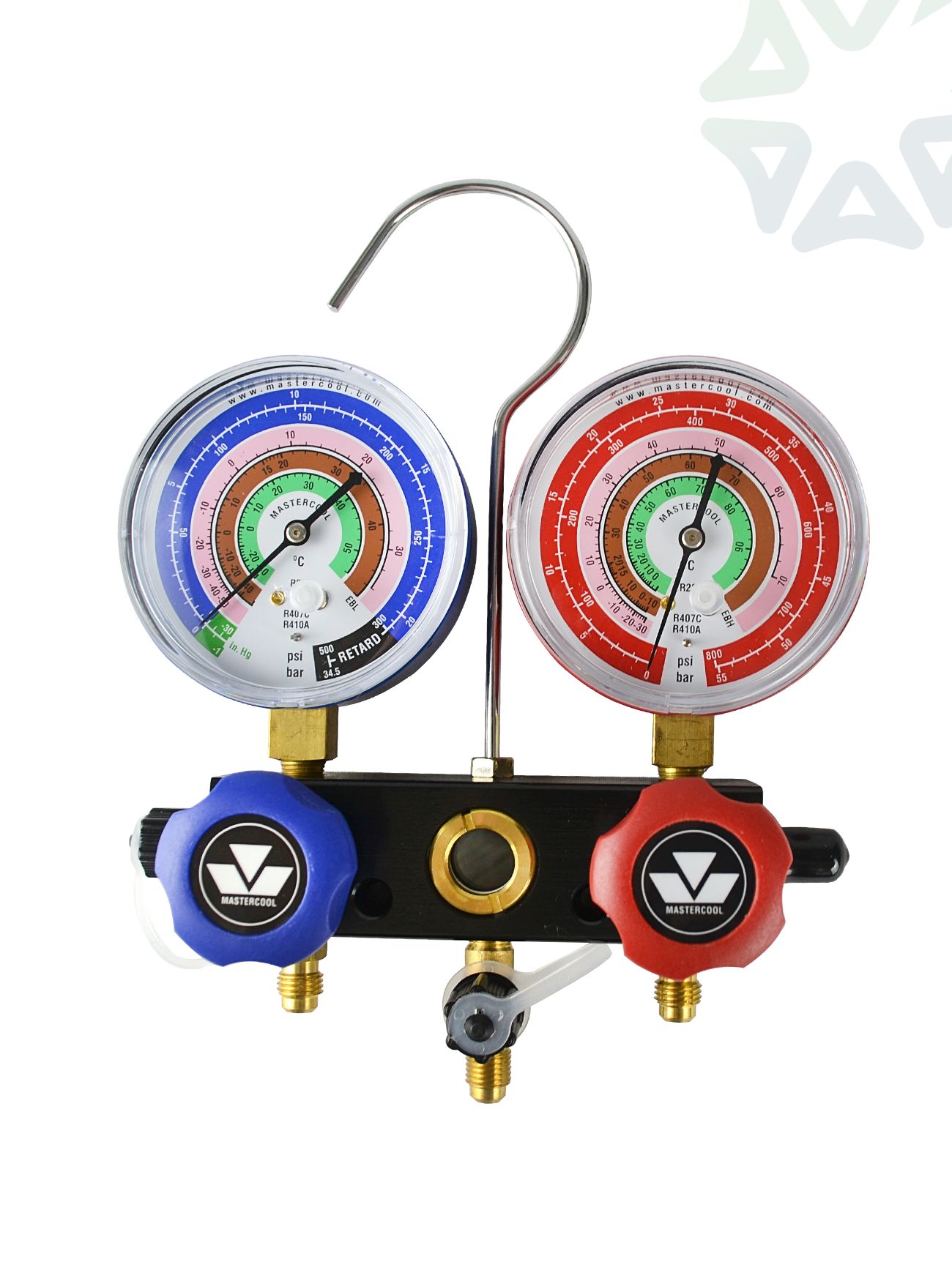 Манометрическая двухвентильная станция 93103-EB от компании Mastercool - это профессиональное оборудование для обслуживания холодильных установок и кондиционеров. Она предназначена для заправки кондиционеров фреонами R410A, R407C, R22 а также для вакуумирования контуров холодильных систем и контроля рабочих давлений. Конструкция коллектора включает в себя два манометра с различными диапазонами измерений, что позволяет проводить диагностику как низкого, так и высокого давления в системе. Корпус прибора выполнен из высокопрочной латуни, устойчивой к коррозии и механическим воздействиям, что гарантирует длительный срок службы даже при интенсивной эксплуатации. Измерительная система оснащена высококачественными манометрами с четкой градуировкой и защитой от вибрации. Шкалы приборов имеют контрастную разметку, что обеспечивает удобство считывания показаний при любом освещении. Точность измерений соответствует профессиональным стандартам, что делает коллектор незаменимым инструментом для диагностики холодильного оборудования.