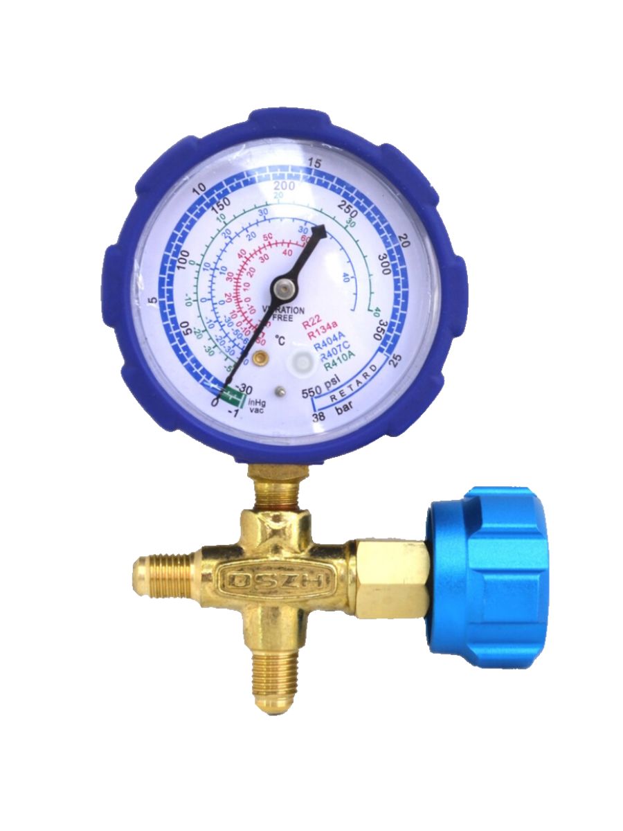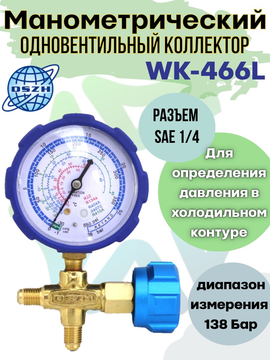 Манометрический одновентильный латуниевый коллектор DSZH WK-466L низкого давления – надёжное и эффективное устройство с разъемом SAE 1/4", созданное для определения давления в холодильном контуре. Оно помогает определить вакуум, давление разных фреонов и температуру их кипения . Основным компонентом манометра является корпус из алюминиевого сплава, покрытый резиной для защиты от повреждений, а металлические вставки в вентилях позволяют увеличить срок службы. Данный манометр предназначен для работы с фреонами R22, R134A, R410A, R407C и имеет диапазон измерения 138 Бар.