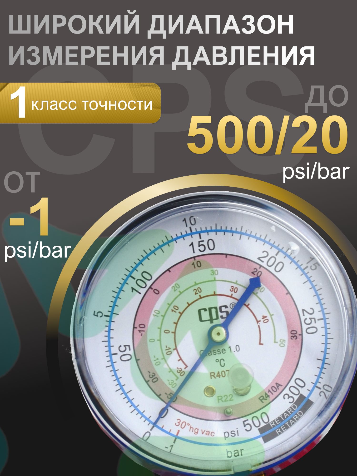 Манометр CPS RGO4L имеет класс точности 1.0, что гарантирует высокую степень достоверности получаемых данных. Диапазон измерения давления составляет от -1 psi/bar до 500/20 psi/bar, что делает его универсальным инструментом для широкого спектра задач. Наличие трех единиц измерения – psi, bar и °С – позволяет пользователю выбирать наиболее удобный формат представления данных.