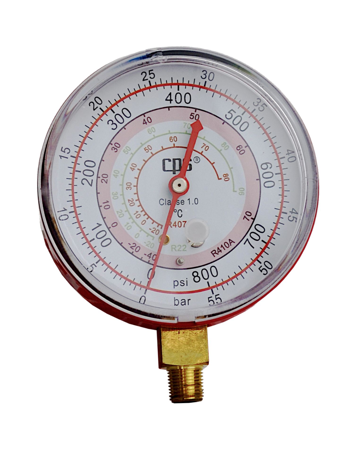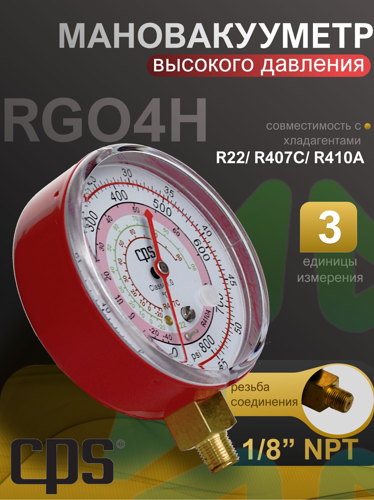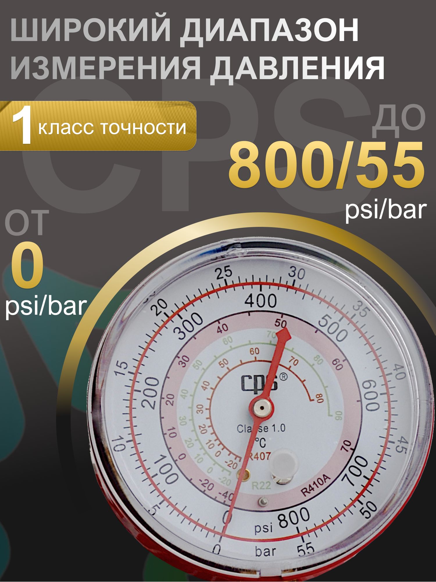 Манометр CPS RGO4H имеет класс точности 1.0, что гарантирует высокую степень достоверности получаемых данных. Диапазон измерения давления составляет от 0 psi/bar до 800/55 psi/bar, что делает его универсальным инструментом для широкого спектра задач. Наличие трех единиц измерения – psi, bar и °С – позволяет пользователю выбирать наиболее удобный формат представления данных.