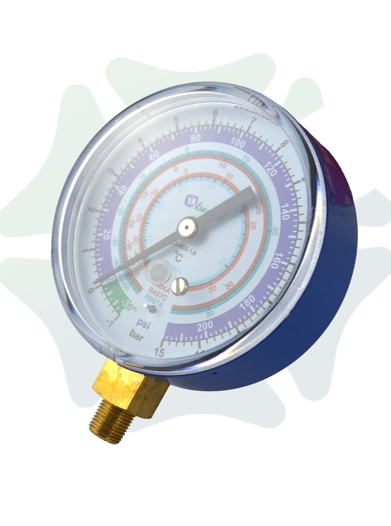 Конструктивные особенности манометра включают прочный корпус из высококачественной стали с защитным синим покрытием. Такое цветовое решение не только выделяет прибор среди других измерительных устройств, но и служит важным идентификатором для обозначения линии низкого давления в системах. Присоединительный элемент представлен латунным штуцером с резьбой М1/8" NPT, обеспечивающим надежное и герметичное соединение.