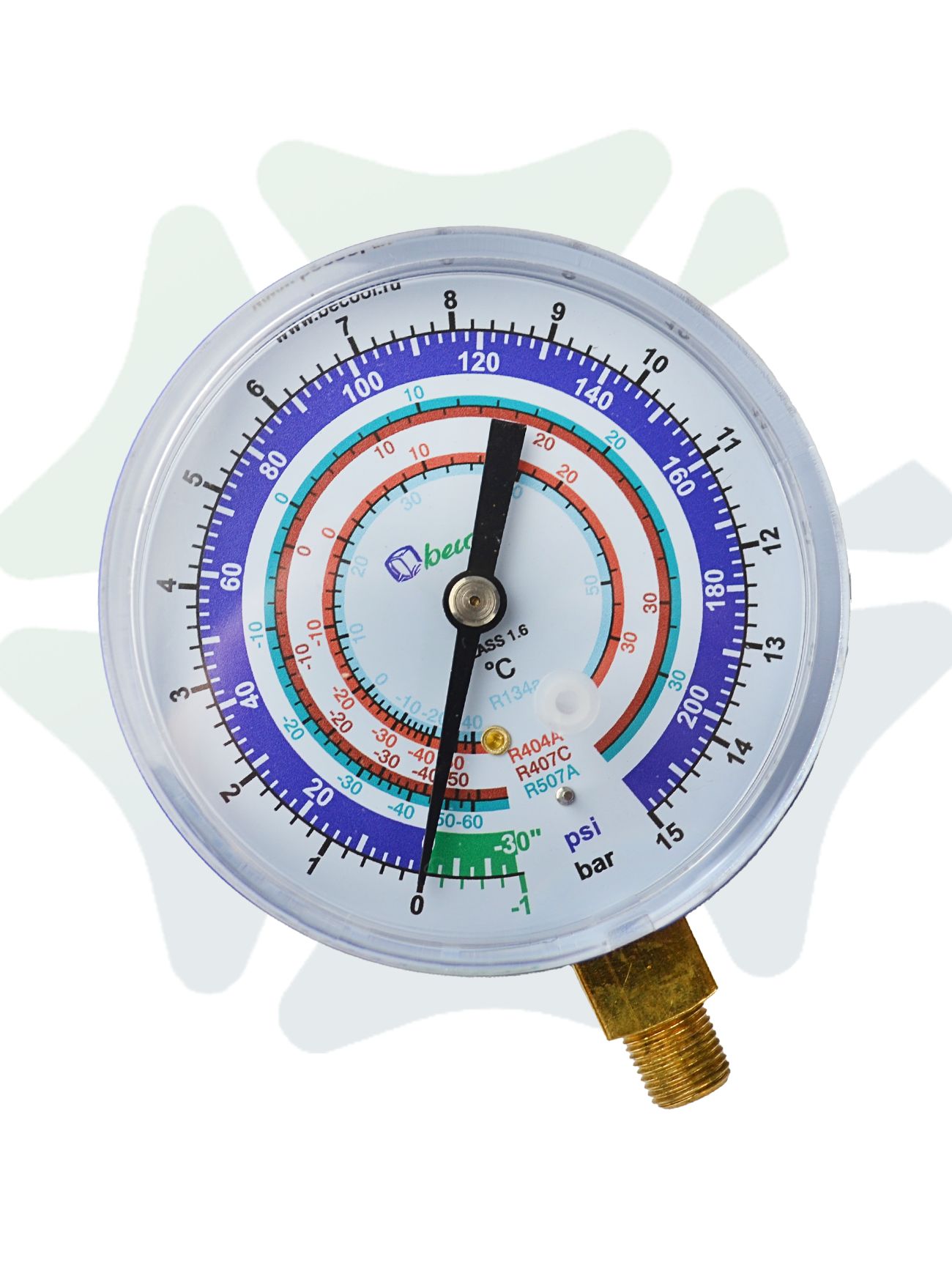 Универсальность применения достигается благодаря совместимости с различными типами хладагентов. На шкале прибора нанесены температурные отметки для популярных фреонов: R22, R134a, R404A и R407C, что позволяет одновременно контролировать как давление, так и температуру в системе.