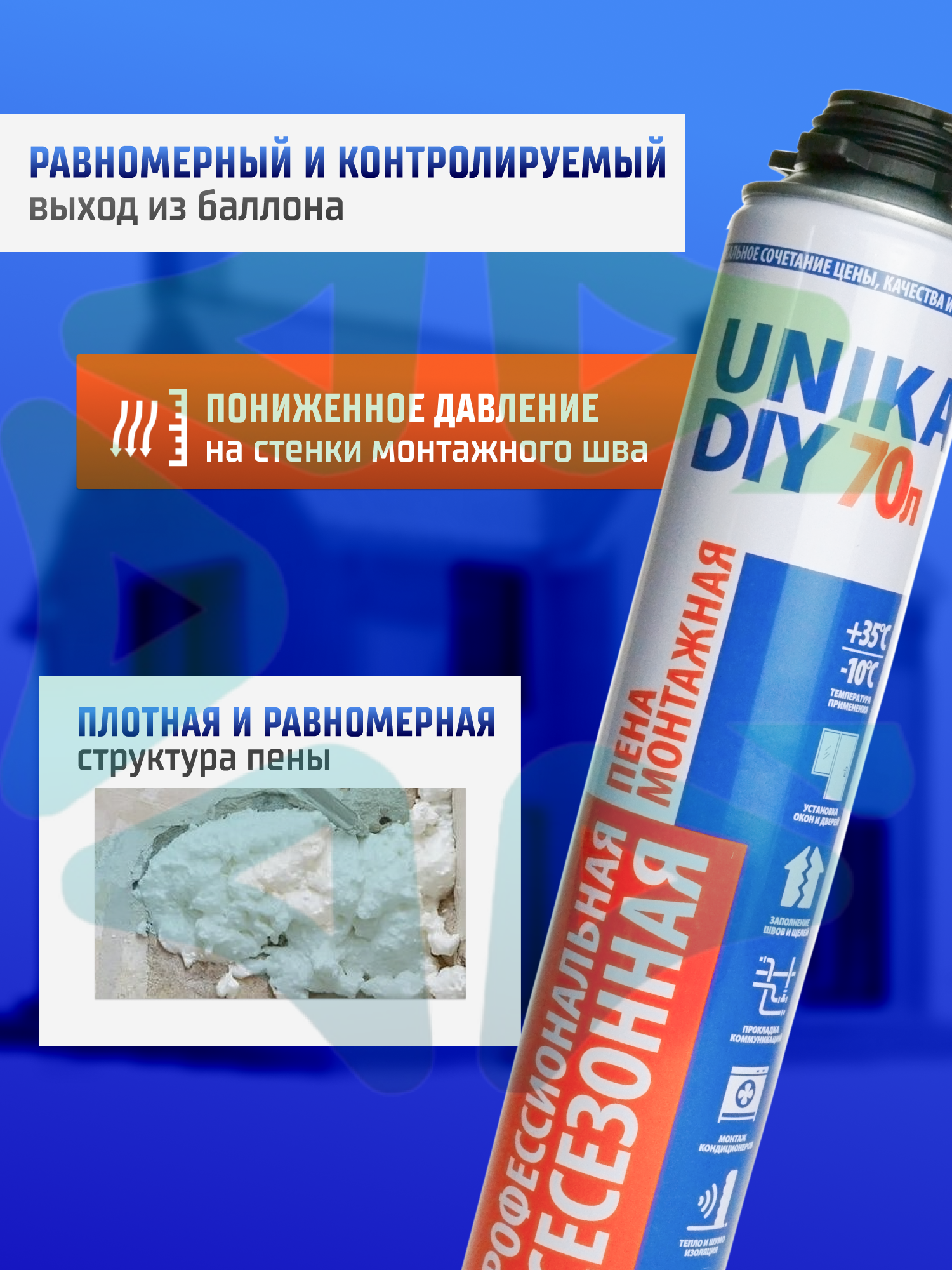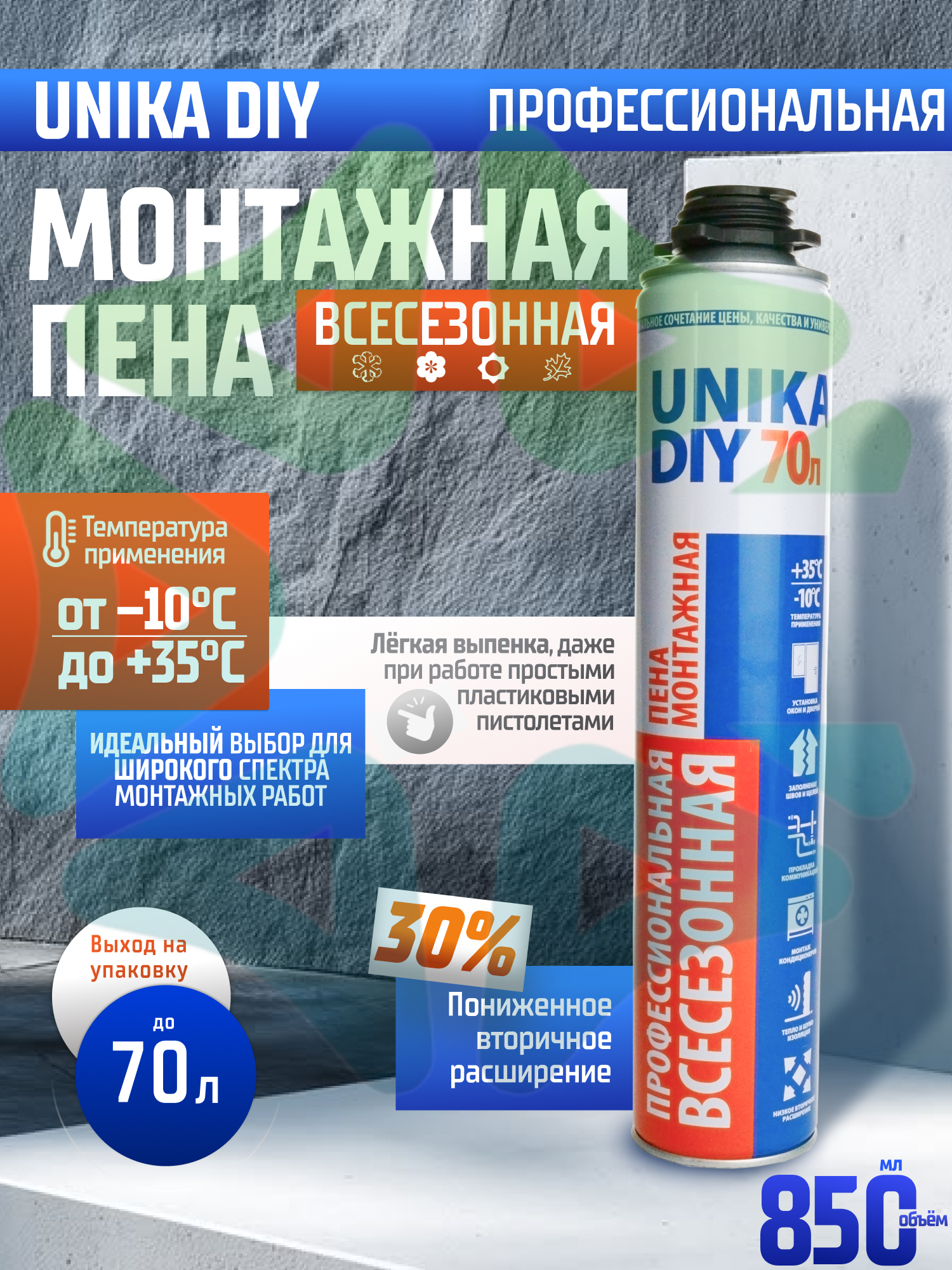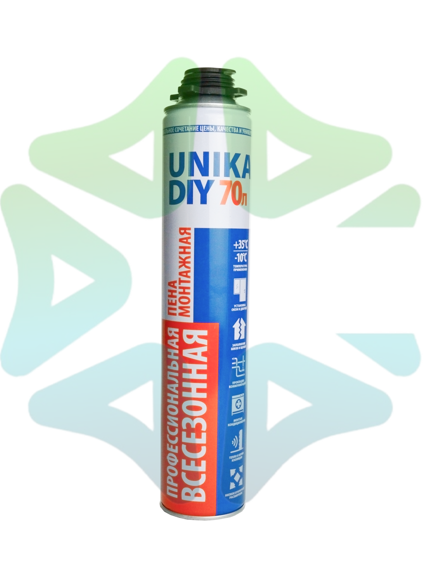 Монтажная пена UNIKA DIY 70 ВСЕСЕЗОННАЯ — современное решение для строительных и монтажных работ на бытовом и профессиональном уровне. Продукт создан с применением передовых технологий, что позволило добиться высокой производительности, отличной звуко и термоизоляции при доступной стоимости.