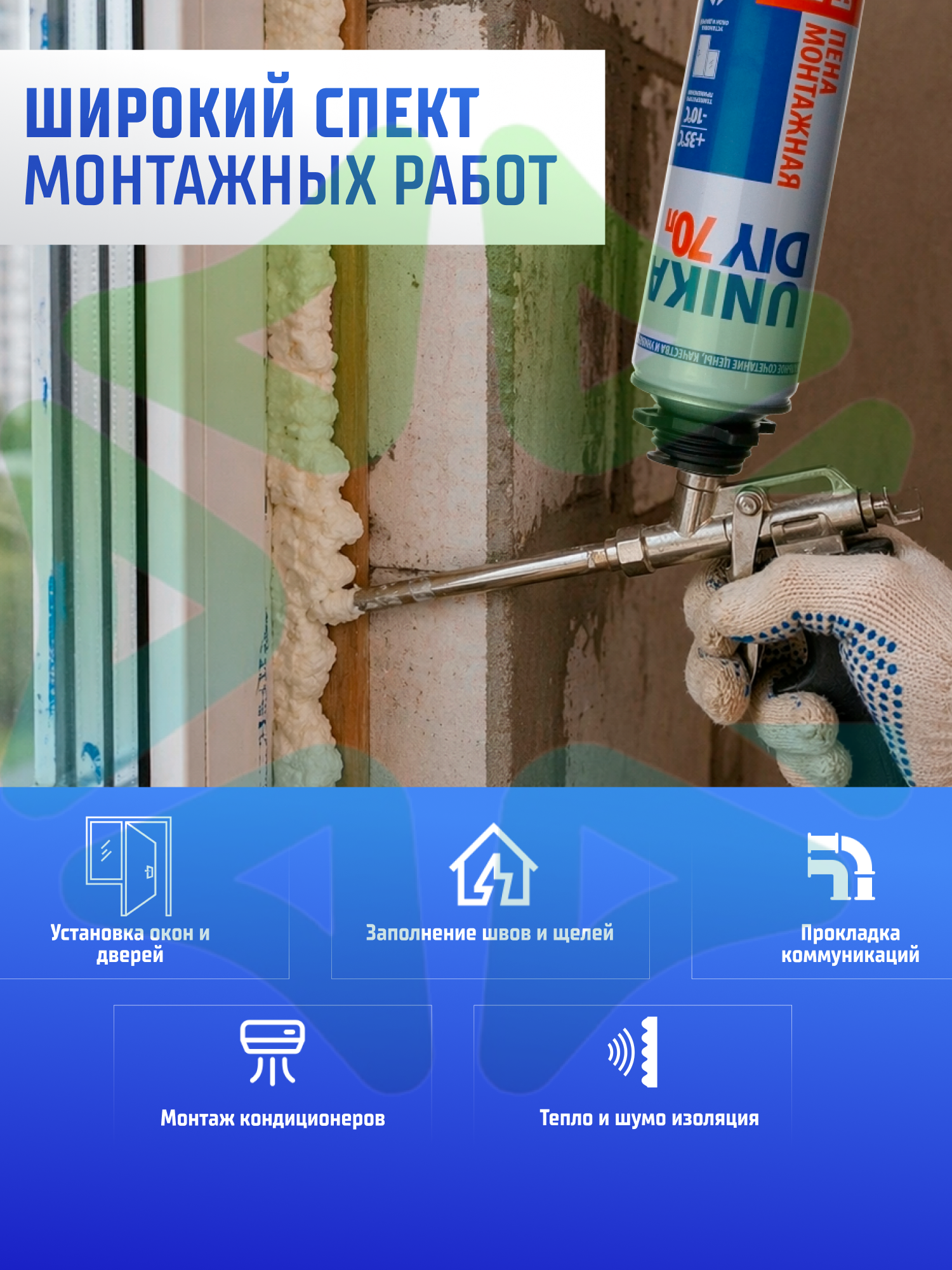 Область применения монтажной пены обширна: она подходит для изоляции, монтажа, склеивания и герметизации строительных конструкций, систем кондиционирования, установки и изоляции дверных коробок и оконных рам, заполнения и герметизации зазоров, швов, проёмов и полостей.