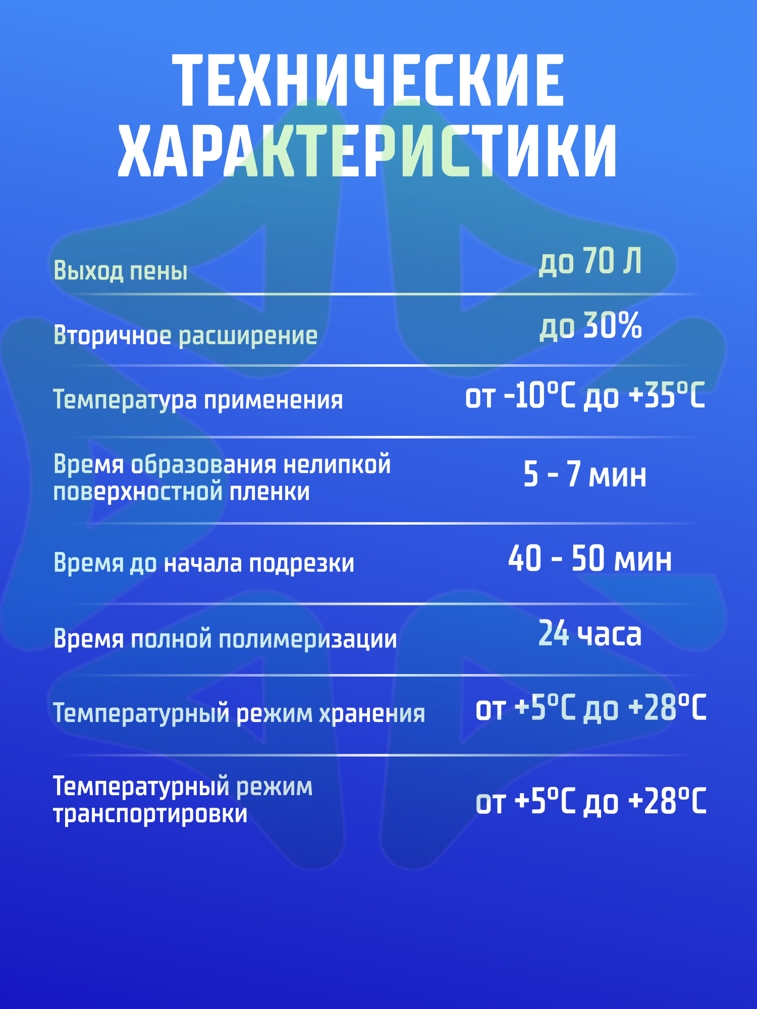 Чтобы добиться максимального выхода пены и оптимальных физико механических показателей, перед использованием выдержите баллон 12 часов при температуре +18…+20 ∘C.