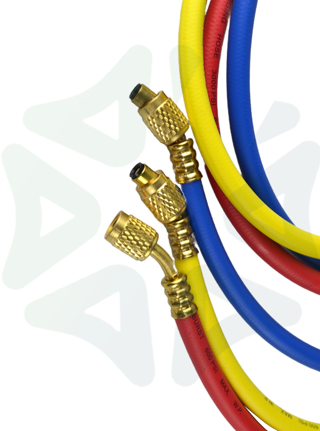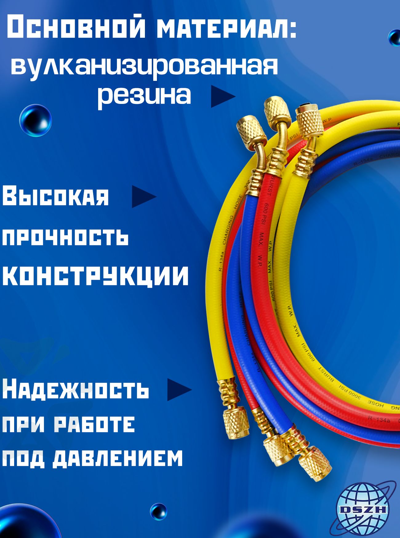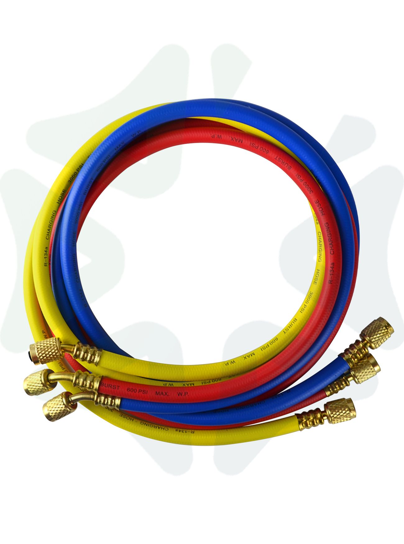 Зарядные шланги CT-360-RYB-P - это набор из трех заправочных шлангов от бренда DSZH , каждый из которых имеет длину 150 см. Шланги обеспечивают надёжное соединение между манометрическими станциями, вакуумными насосами, баллонами с хладагентом и сервисными вентилями оборудования. Этот набор является неотъемлемым инструментом в арсенале специалистов, занимающихся диагностикой, вакуумированием, заправкой и техническим обслуживанием климатической техники различного класса — от бытовых сплит‑систем до промышленных холодильных агрегатов. Все шланги оснащены резьбовыми соединениями 1/4" SAE с обеих сторон, что гарантирует совместимость со стандартным сервисным оборудованием. Комплект включает шланги трёх цветов — красный, жёлтый и синий — для удобной идентификации линий высокого и низкого давления, а также вспомогательных контуров. Армирование из текстильного материала (лавсана) в сочетании с вулканизированной резиной обеспечивает высокую прочность и гибкость, позволяя шлангам выдерживать рабочее давление до 41 бар (около 600 PSI) и давление разрыва до 3000 PSI. Набор совместим с широким спектром хладагентов, включая R‑32, R‑22, R‑134a, R‑404A, R‑407C и R‑410A.