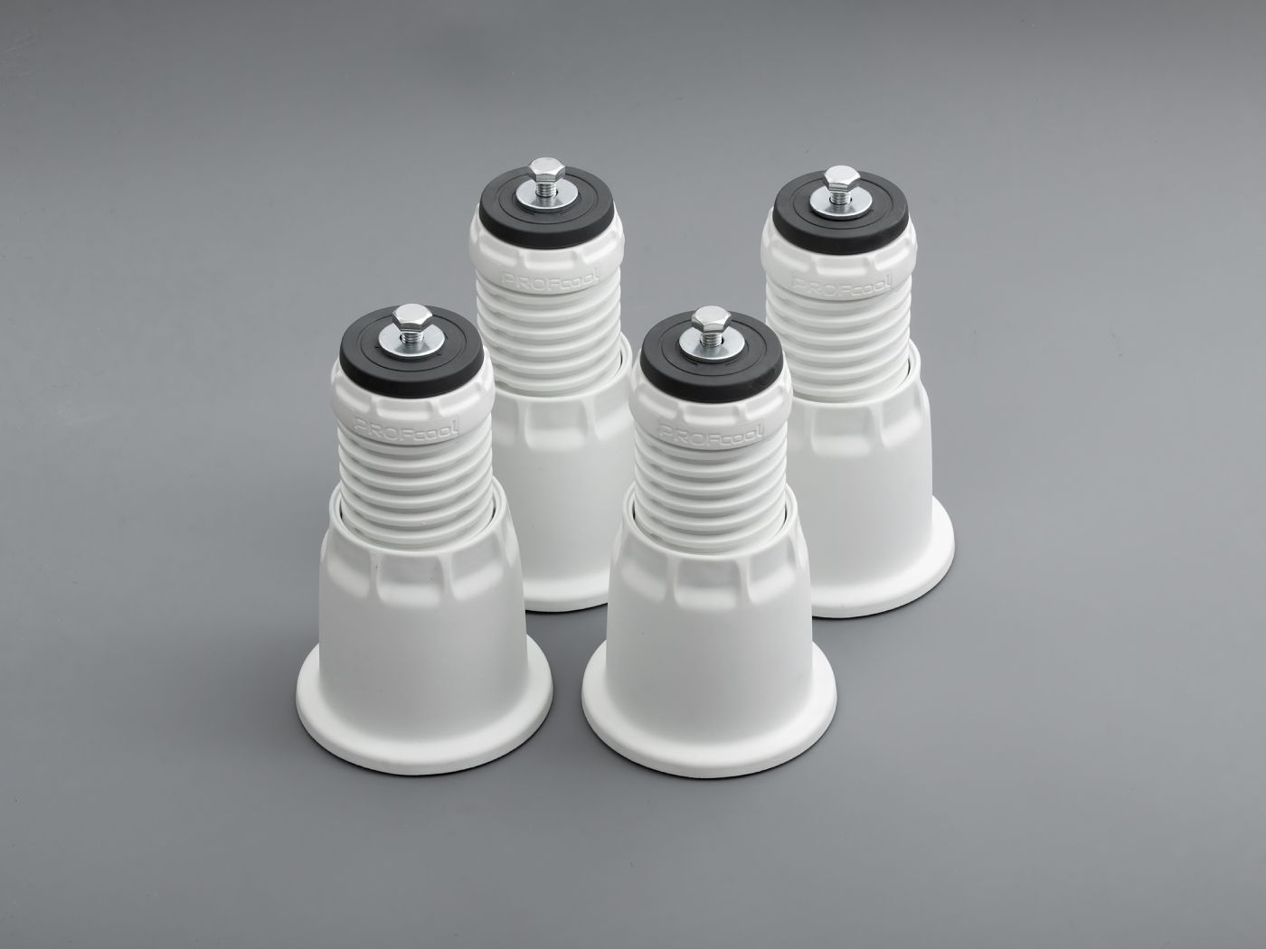 Комплект состоит из четырех опор имеющих регулируемую резьбовую часть, способную менять высоту опоры с 115 до 163 мм. Каждая из опор полностью автономна друг от друга, что позволяет располагать на них технику различного вида, а так же размеров, весом до 800 кг. Подставки уменьшают вибрацию и шум от установленного на них оборудования за счет колец между подставками и основанием, а так же демпферов сверху опор.