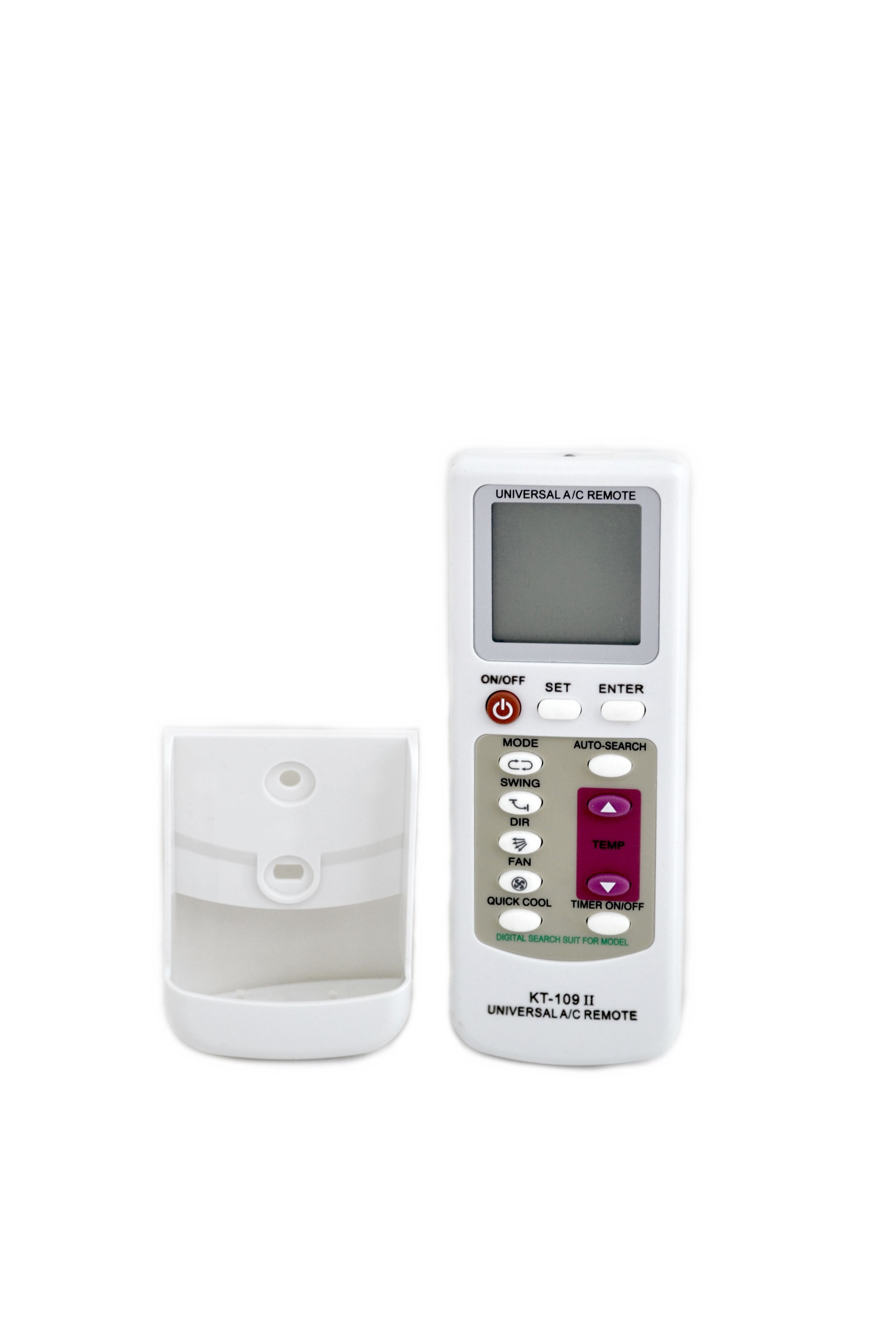 Универсальный пульт управления KT-109 II - устройство для управления кондиционерами большого количества марок и моделей. Пульт имеет в памяти коды для 1000 разных моделей.Совместим с большинством брендов кондиционеров. Пульт управления прост в использовании, имеет функции как автоматического поиска,так и ручного поиска кода.