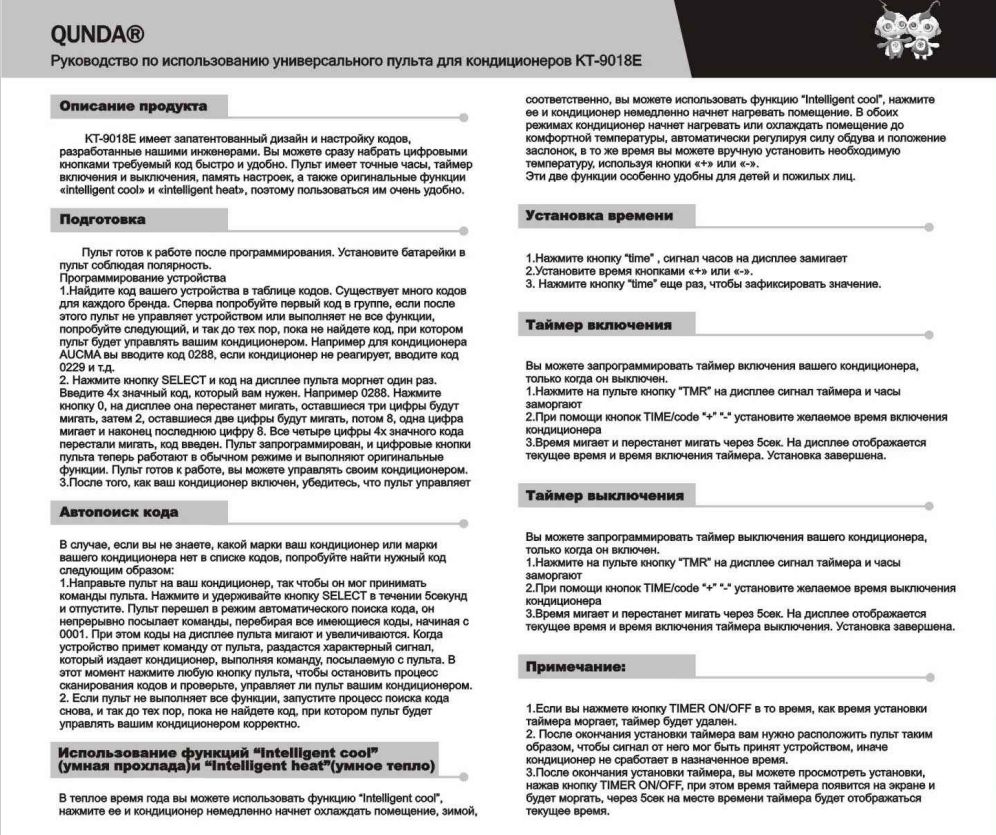Универсальный пульт управления KT-9018E - устройство для управления кондиционерами большого количества марок и моделей. Пульт имеет в памяти коды для 4000 разных моделей.