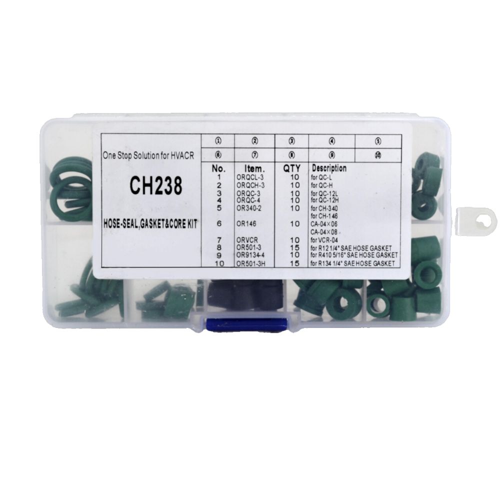 Ремкомплект CH-238 необходим для проведения ремонтных работ и замены деталей в различных механизмах и оборудовании. Благодаря этому комплекту можно быстро и эффективно восстановить работоспособность сломавшегося оборудования, избежать простоев и снизить риски повреждения других деталей. Ремкомплект CH-238 является надежным помощником для специалистов по обслуживанию техники и позволяет быстро вернуть ее в рабочее состояние. Он включает в себя прокладки и уплотнители для шлангов и муфт: QC-L, QC-H, QC-12L, QC-12H, CH-340, CH-416, VCR-04