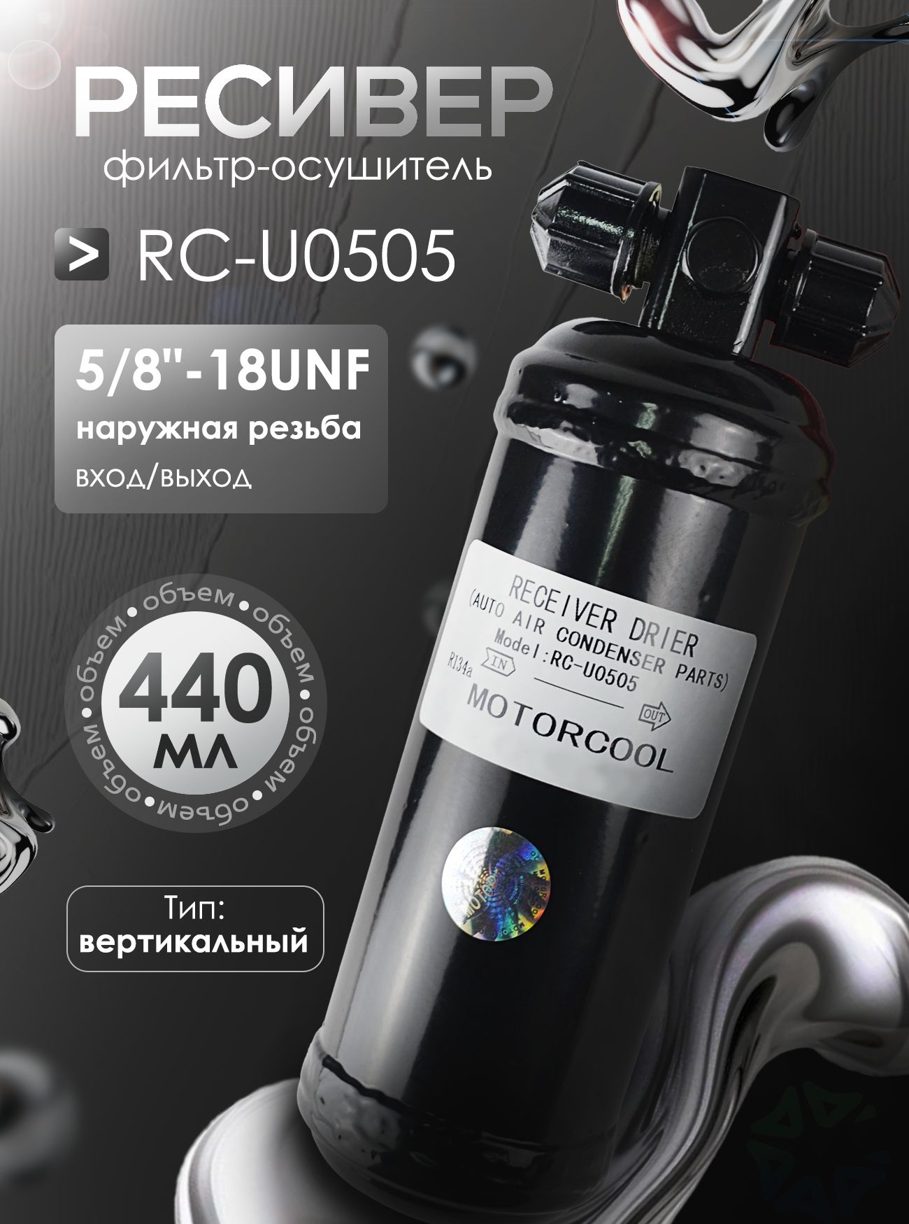 Ресивер RC-U0505 — это фильтр-осушитель вертикального типа, предназначенный для установки в системах кондиционирования грузовых автомобилей, автобусов, сельскохозяйственной и специальной техники. Его основная функция — очистка и осушение хладагента, циркулирующего в контуре, от влаги, кислот и механических загрязнений, что обеспечивает надёжную защиту компрессора и других узлов системы. Корпус ресивера выполнен из высокопрочной стали с антикоррозийным покрытием, что гарантирует долгий срок службы даже в условиях повышенной вибрации и перепадов температур. Общая высота устройства составляет 200 мм, диаметр корпуса — 60 мм, внутренний объём — 440 мл, что делает его подходящим для систем с высокой производительностью.