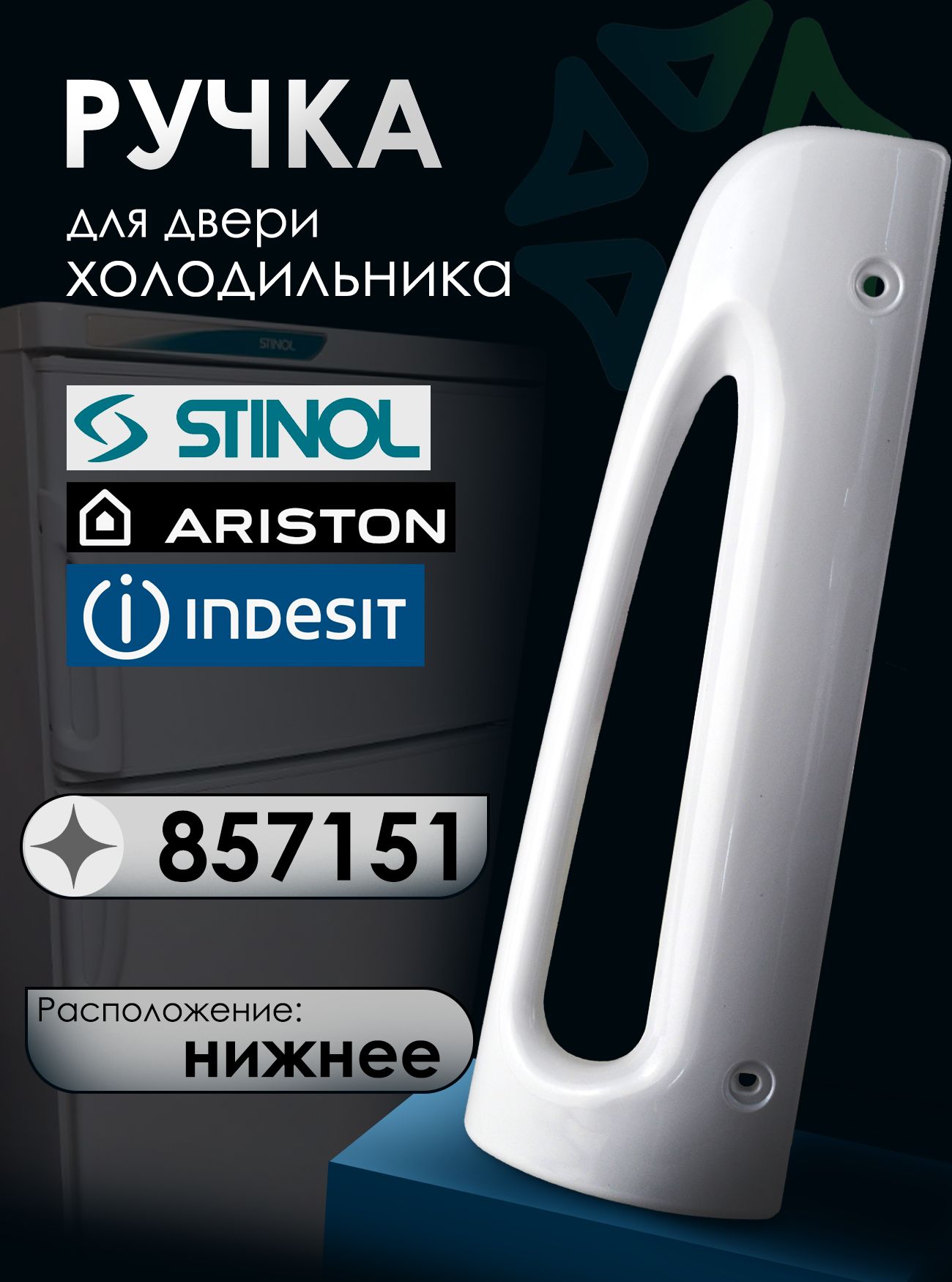 Ручка двери холодильника, нижняя, 857151 представляет собой универсальный элемент управления, предназначенный для комфортного открывания и закрывания дверцы холодильного оборудования. Данная модель разработана для нижнего расположения на дверце и совместима с холодильниками брендов Stinol, Indesit и Ariston.